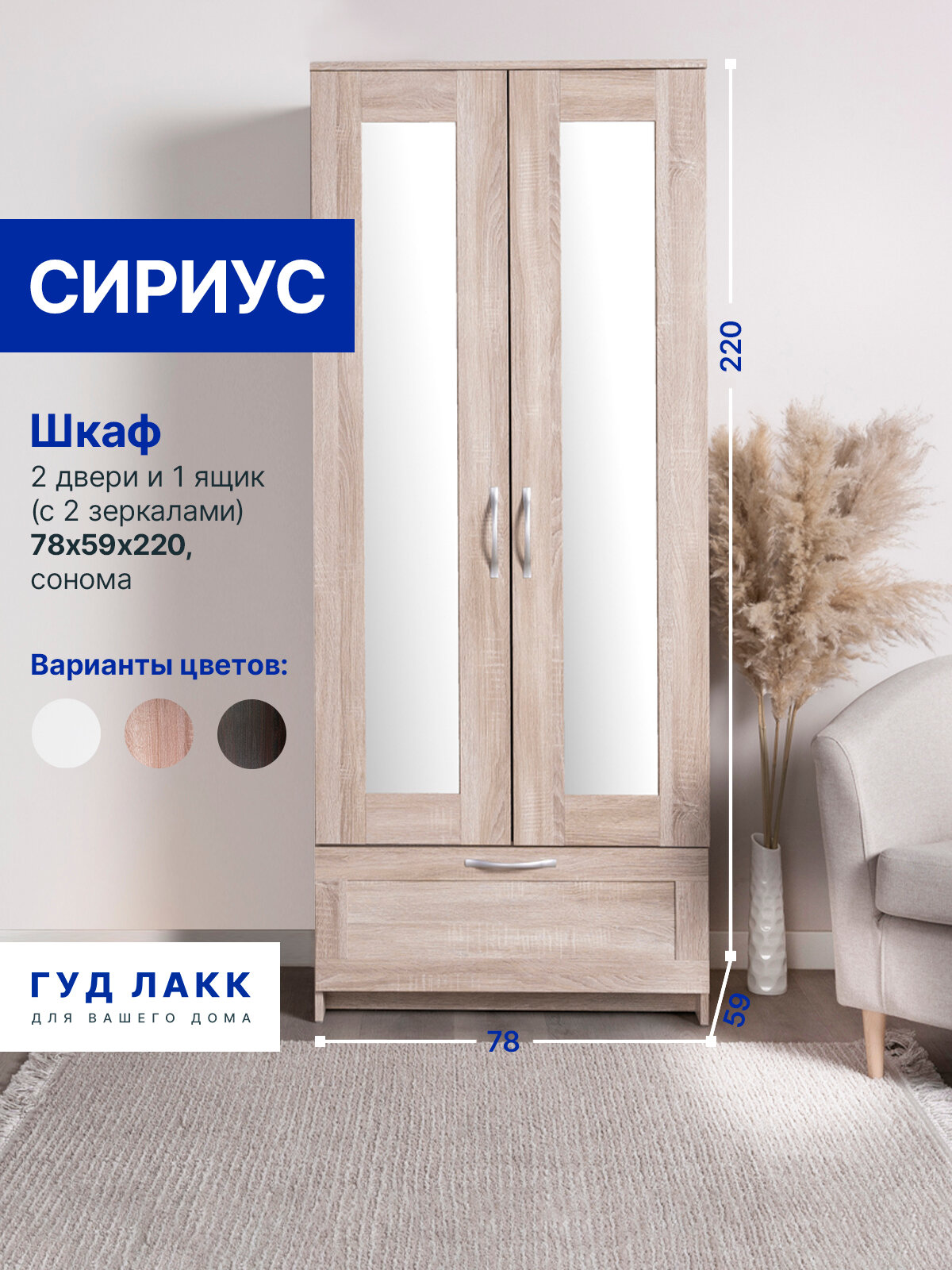 Почему выбирают Шкаф ГУД ЛАКК СИРИУС, 2 двери и 1 ящик с зеркалом, 220x78x59 см? Этот шкаф СИРИУС с увеличенной высотой — 220 см, для максимального использования пространства!