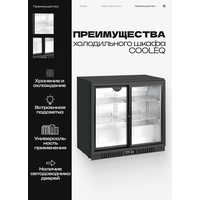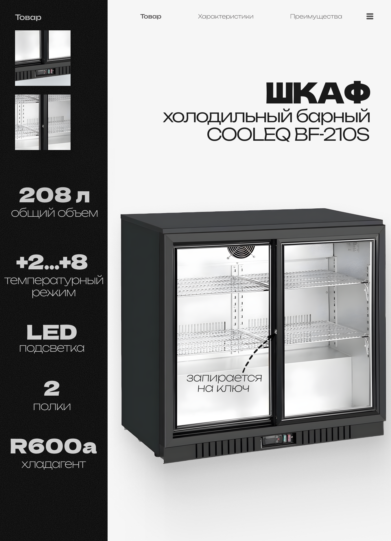 Холодильный шкаф COOLEQ BF-210S предназначен для демонстрации, охлаждения напитков на предприятиях общественного питания и торговли. Прибор оснащен стеклянной раздвижной дверью и LED-подсветкой. Шкаф имеет прочную конструкцию и износоустойчивые внутренние компоненты, что гарантирует длительный срок службы. Технические характеристики