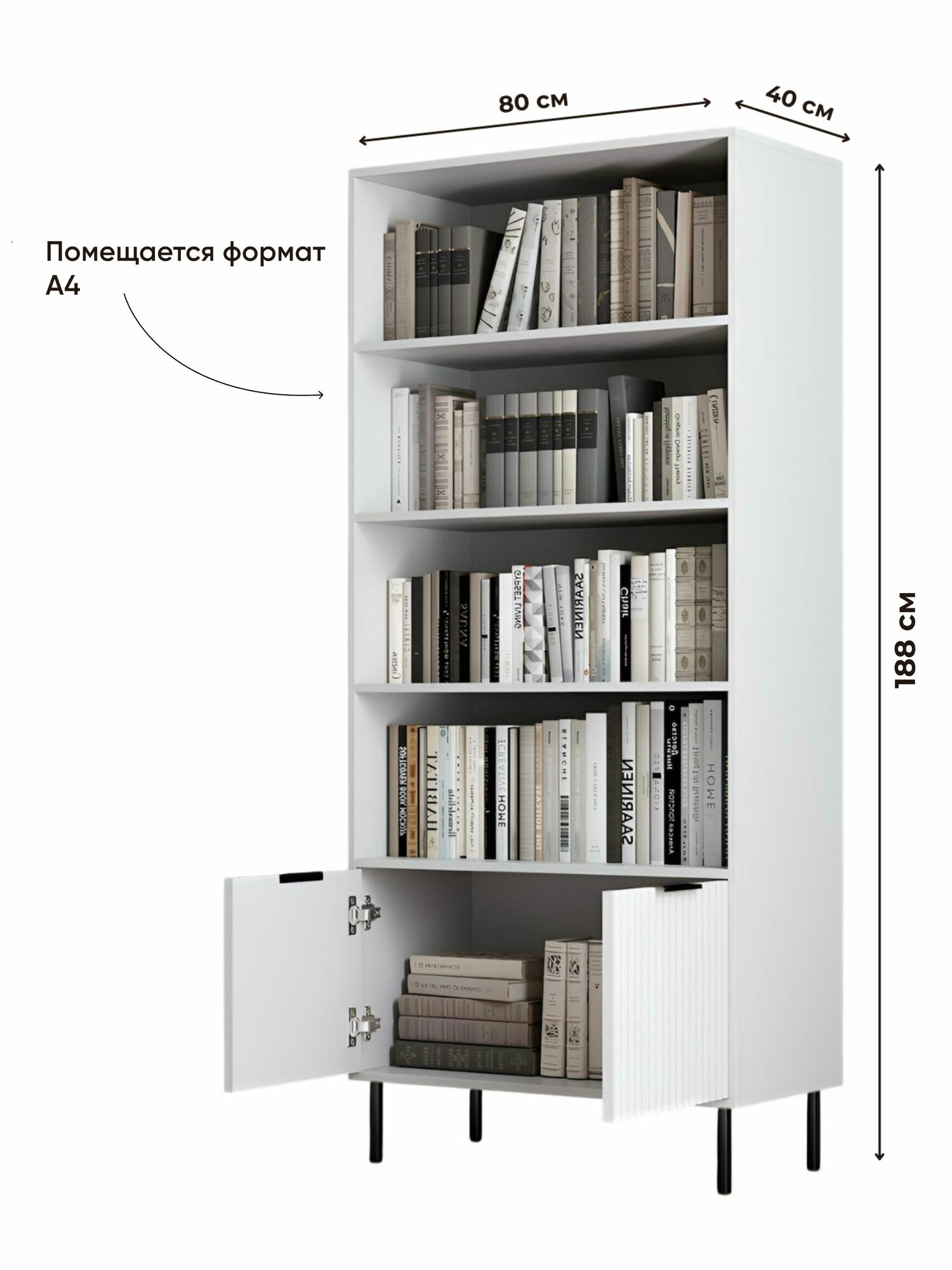 Купить Шкаф книжный напольный на ножках BORDO Raenyra, 188*80*40 см, белый/черный с доставкой по всей России.