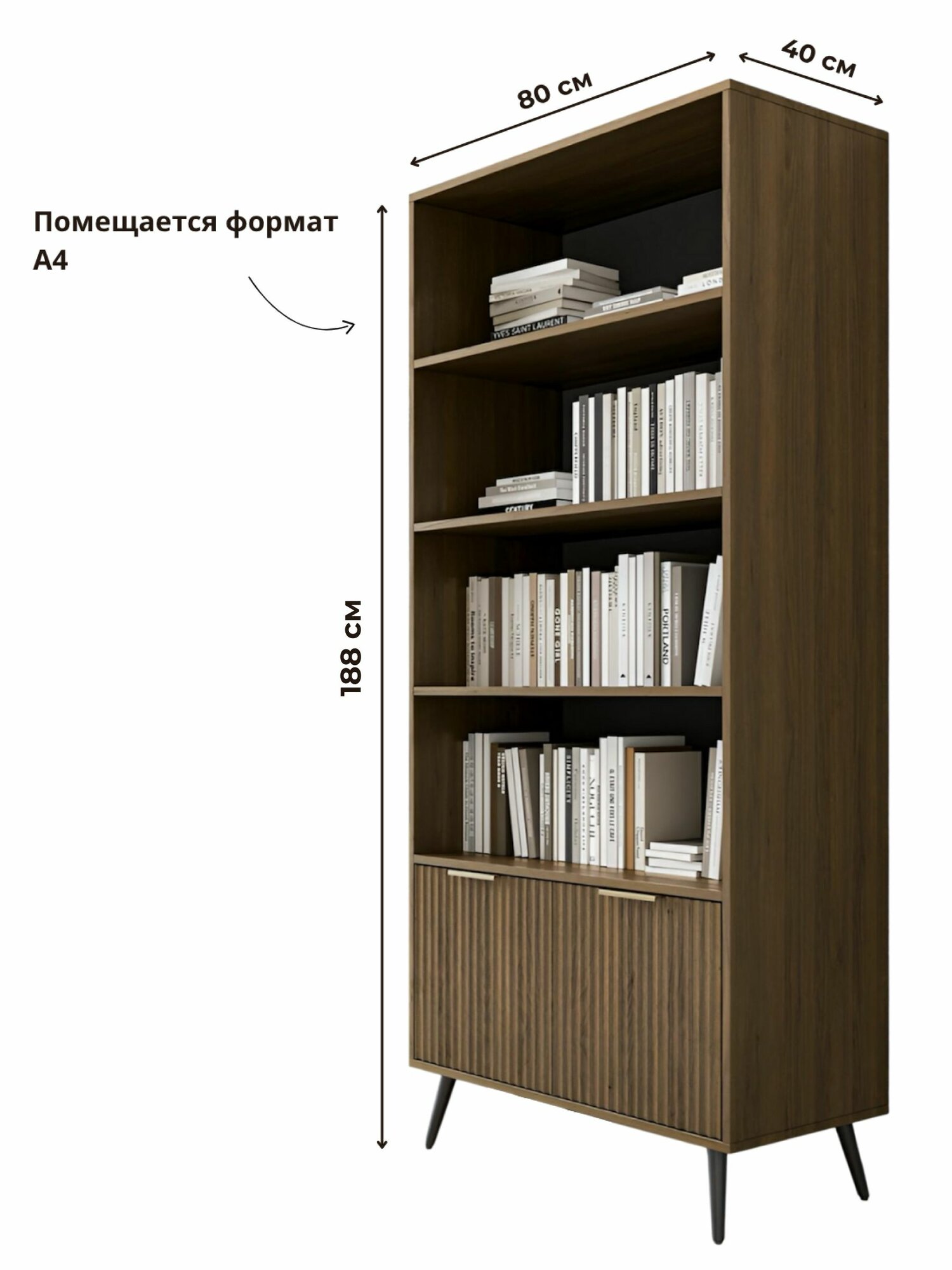 Размеры шкафа 180 см в высоту, 80 см в ширину и 40 см в глубину обеспечивают достаточно места для размещения многочисленных книг, папок и других предметов. С его помощью вы сможете аккуратно упорядочить вашу коллекцию литературы и сделать её доступной в любой момент. Этот книжный шкаф не только делает вашу библиотеку более организованной, но и служит элементом декора, добавляя уют и комфорт.