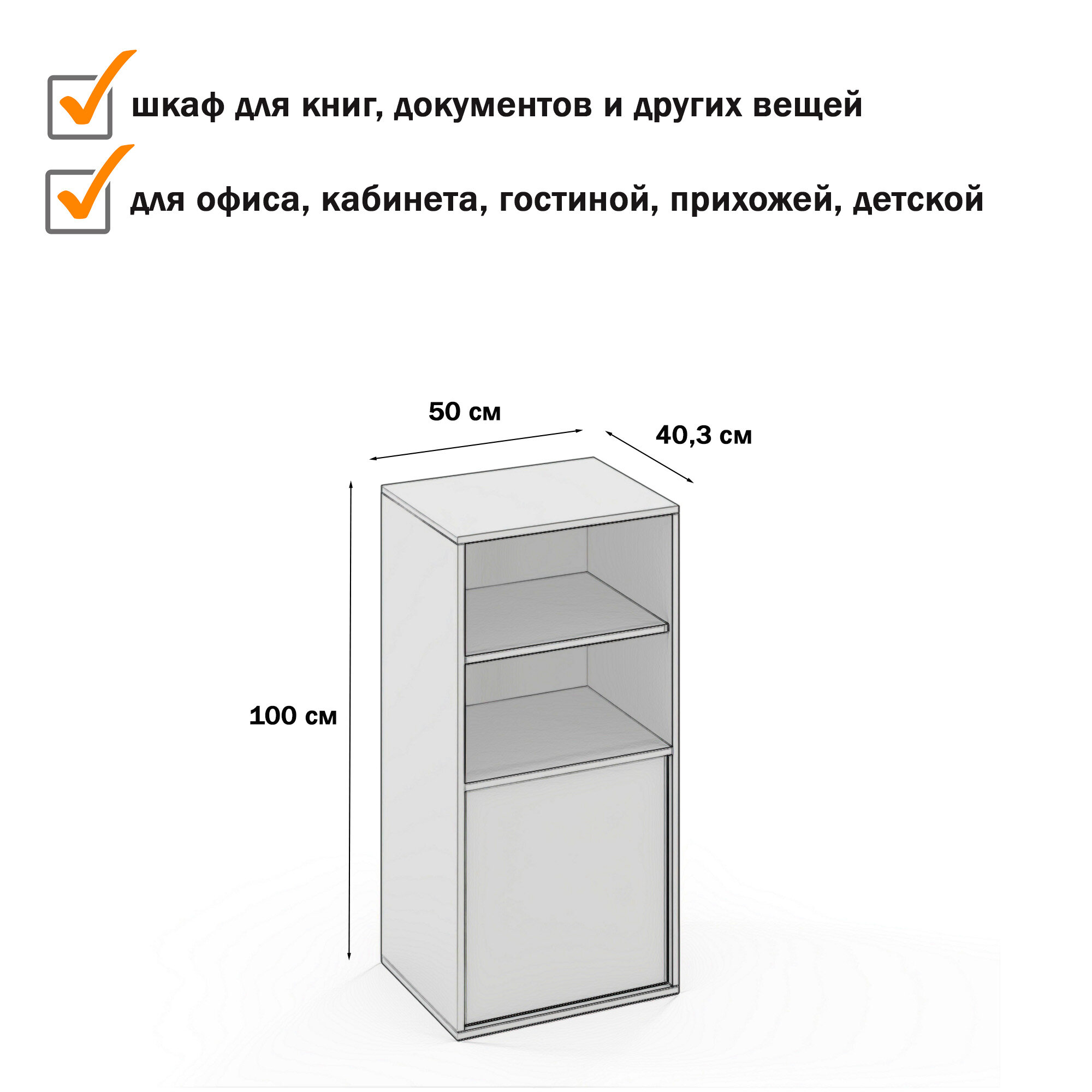 Особенность шкафа – отсутствие ручек, дверцы открываются нажатием. Размеры шкафа: 50x40,3х100 см, это делает его достаточно вместительным и позволяет разместить всё необходимое.