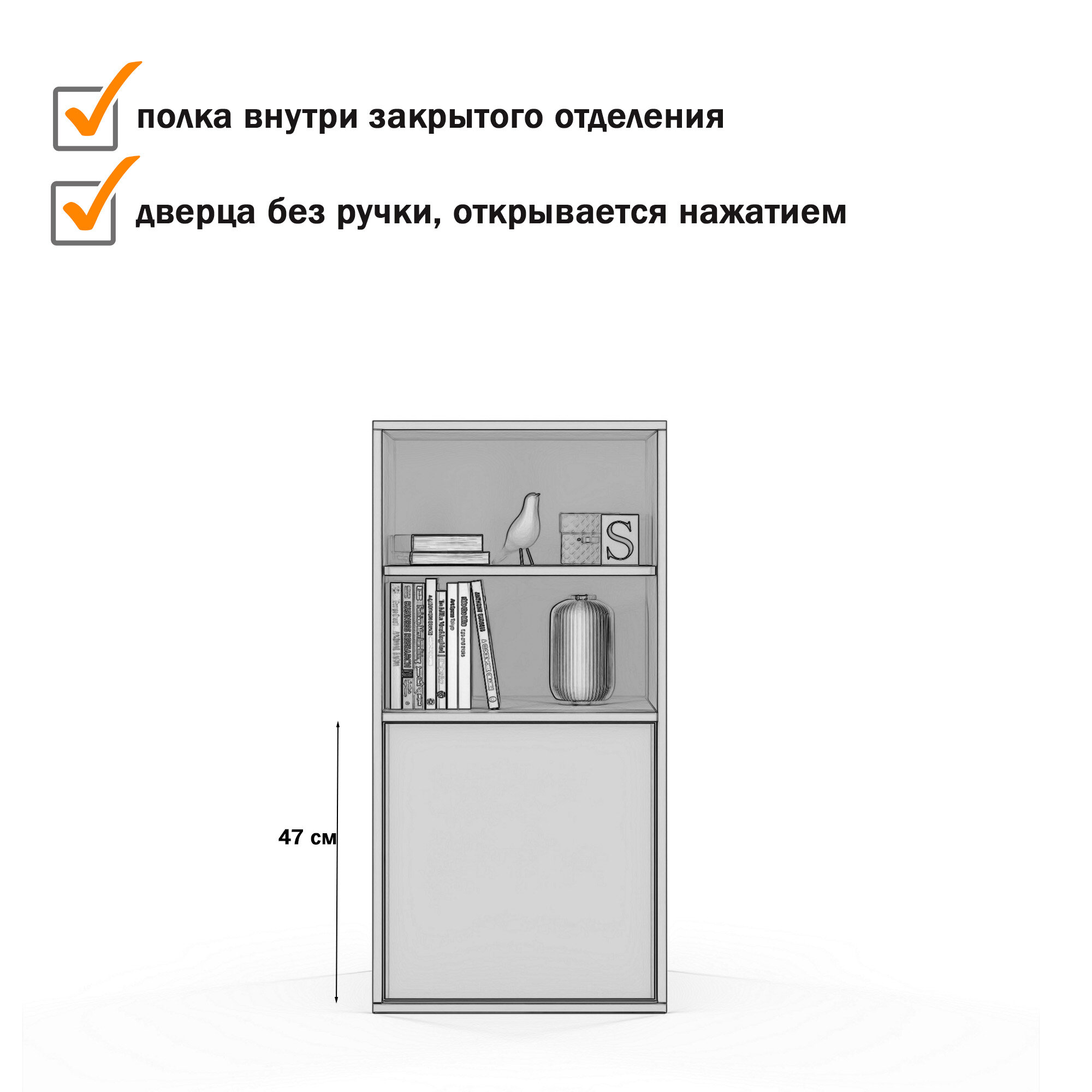 Особенность шкафа – отсутствие ручек, дверцы открываются нажатием. Размеры шкафа: 50x40,3х100 см, это делает его достаточно вместительным и позволяет разместить всё необходимое.