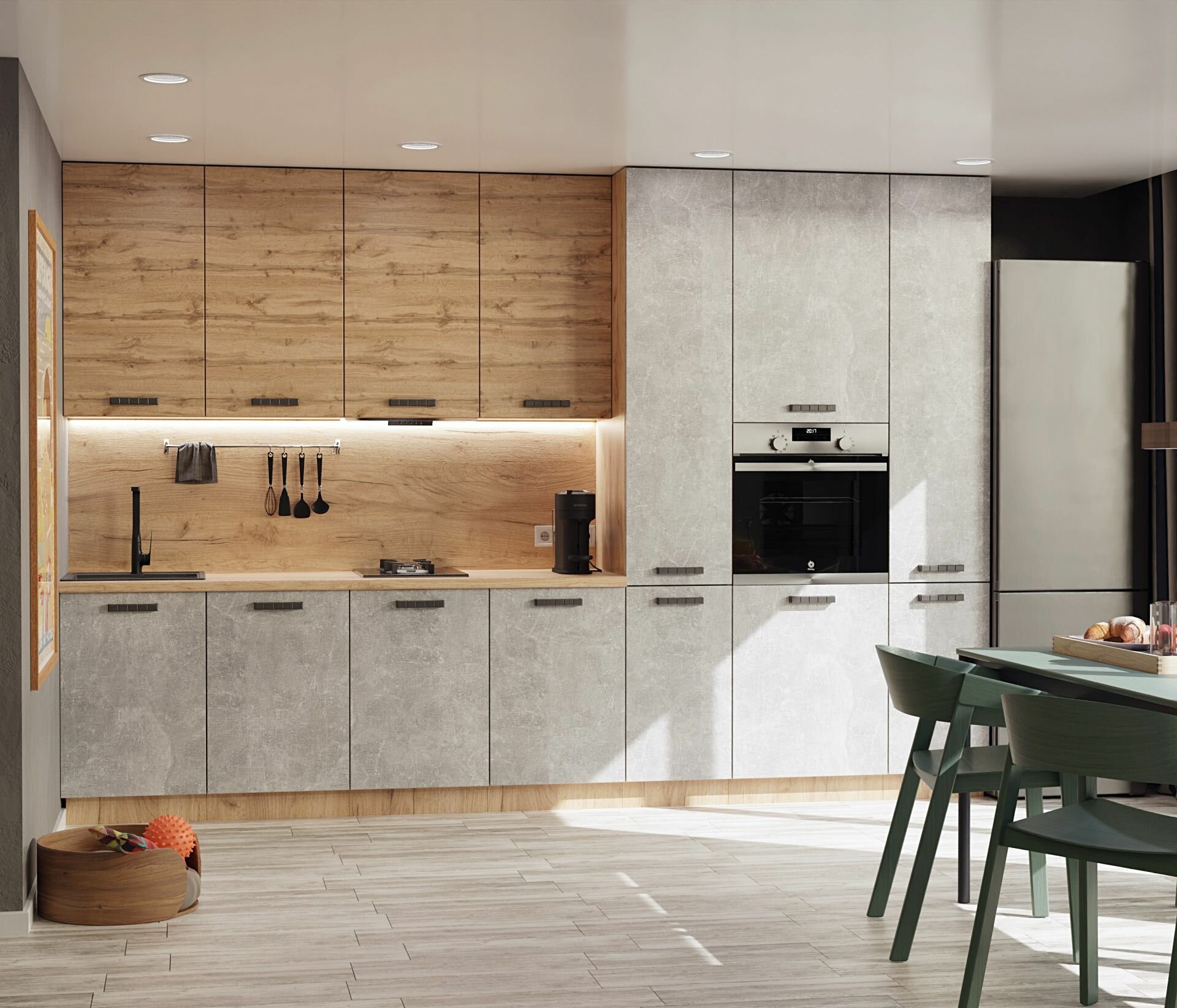 Кухонный гарнитур "Лаванда" (со столешницей) Серия 2 Белый / Сосна Санторини светлый / Чёрный матовый