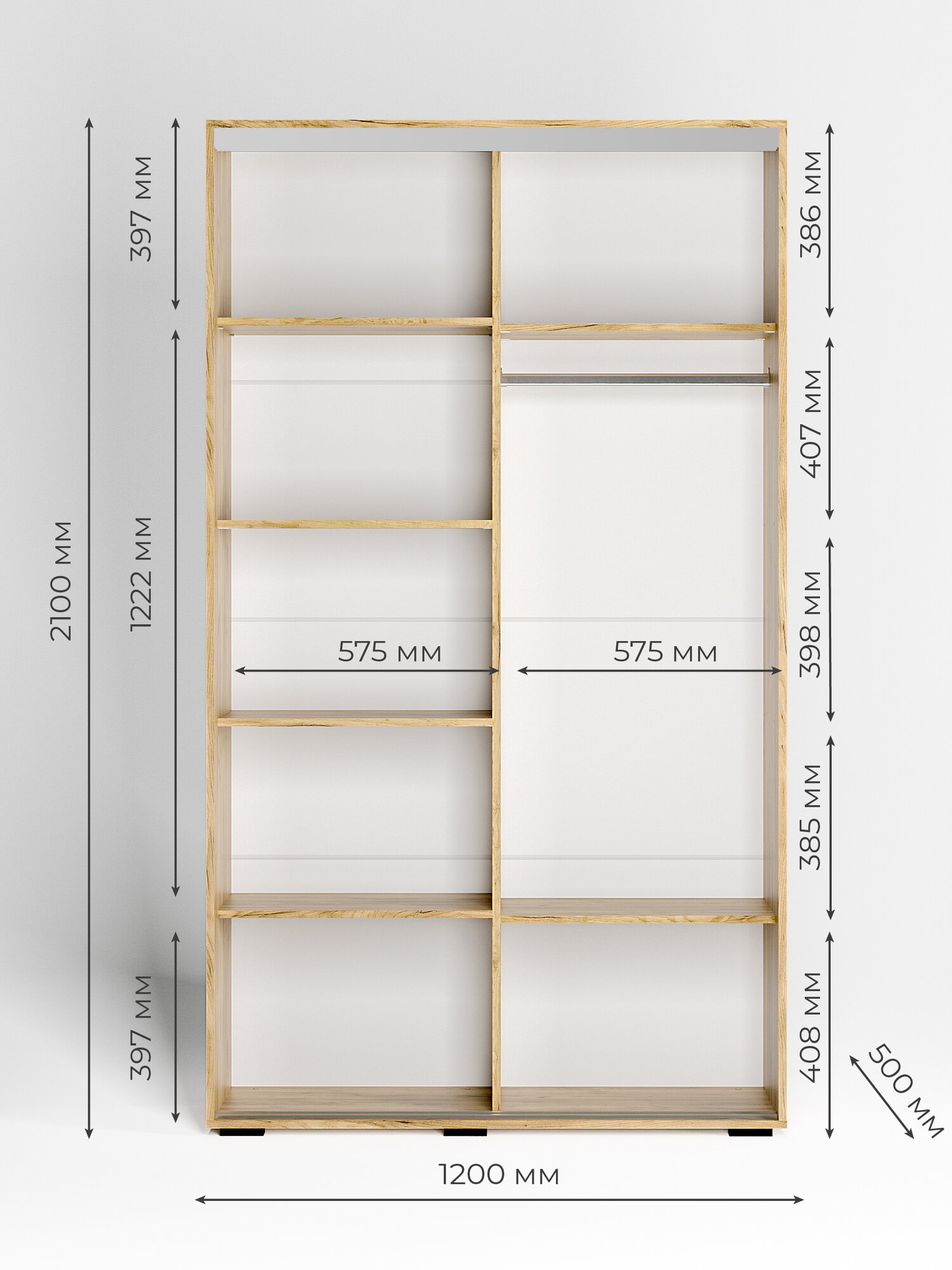 Изготовленный из качественного ЛДСП материала, этот напольный шкаф обладает прочностью и долговечностью. Система организации позволяет легко структурировать место внутри: полочки для белья, просторное отделение с вешалкой в виде штанги для верхней одежды и полки для обуви обеспечивают удобный доступ к вашим вещам.