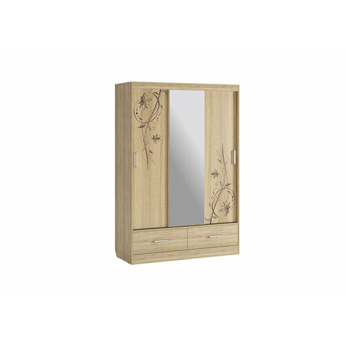 Шкаф-купе «Виктория-1» изготовлен из ЛДСП в цвете дуб сонома. Центральный фасад зеркальный. Боковые фасады украшает элегантный рисунок - коричневые цветы.