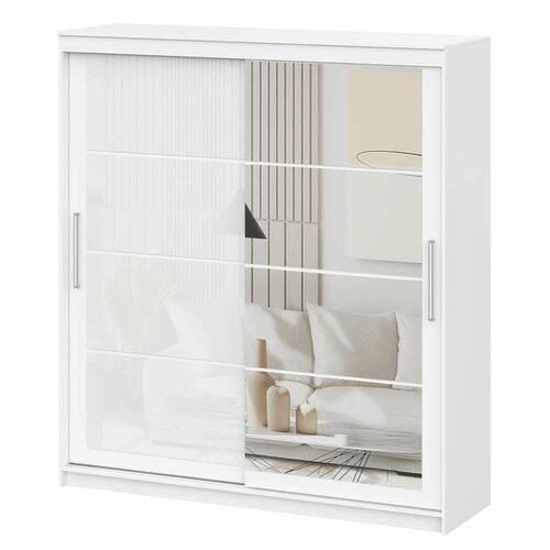 Изделие представляет собой Шкаф с двумя створками купе, левое отделение оснащено полками и двумя выкатными ящиками, правое отделение оснащено штангой для хранение одежды на вешалках.