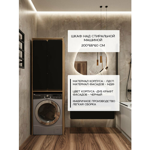 Шкаф над стиральной машиной. Габаритные размеры: высота 200 см, глубина 60 см, ширина 65 см. Цвет корпуса ЛДСП Дуб Крафт, цвет фасадов МДФ - Черный матовый. В комплекте крепеж, петли, монтажные планки. Вам остается подобрать метизы по типу Вашей стены. Рекомендуем крепить шкаф к стене, во избежании падения конструкции. Петли с доводчиком, скрытые "ручки" - удобство в использовании шкафа.