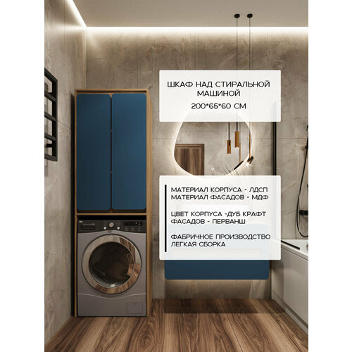 Шкаф над стиральной машиной. Габаритные размеры: высота 200 см, глубина 60 см, ширина 65 см. Цвет корпуса ЛДСП Дуб Крафт, цвет фасадов МДФ - Перванш матовый (синий). В комплекте крепеж, петли, монтажные планки. Вам остается подобрать метизы по типу Вашей стены. Рекомендуем крепить шкаф к стене, во избежании падения конструкции. Петли с доводчиком, скрытые "ручки" - удобство в использовании шкафа.