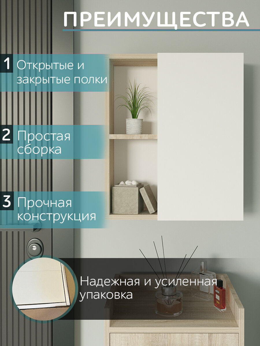 Шкаф навесной с нишей сбоку 50 см Дуб сонома для ванной и туалета Уклад - это идеальное решение для организации пространства в вашей ванной или туалете. Он имеет удобные размеры и стильный дизайн, который отлично впишется в любой интерьер. Навесной шкаф оборудован нишей, что позволяет хранить различные вещи и аксессуары. Таким образом, вы сможете упорядочить все необходимые предметы и сохранить порядок в ванной комнате. Цвет шкафа дуб сонома придает ему элегантность и изысканность. Он добавит нотку стильности и современности в вашей ванной, делая ее более привлекательной и уютной. Кроме того, цвет под светлое дерево легко сочетается с другими элементами интерьера. Материал, из которого изготовлен шкаф, - высококачественный и прочный ЛДСП. Это гарантирует долговечность и надежность изделия. Шкафчик также имеет практичную поверхность, легкую в уходе и очень простую в чистке.