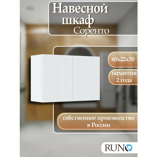 Шкаф с полками навесной Runo Соренто 60х30 (двустворчатый) - отличное решение для современного оформления Вашего дома. Волнистые рифленые фасады визуально «оживляют» и «приводят в движение» всю обстановку комнаты, сохраняя при этом умиротворение и покой. Шкафчик выполнен в традиционном и всегда модном белом цвете и гармонично впишется в любой интерьер. Шкаф навесной отлично впишется в ванную комнату, где Вы сможете его использовать для дополнительного хранения как шкаф навесной для ванной над стиральной машиной или мини шкаф пенал с полками. Можно использовать его и как шкаф в прихожую, где он будет использован как шкаф антресоль, и станет изюминкой Вашего помещения, привлекая к себе внимание своим необычным дизайном. Также можно найти применение ему на кухне, где использовать его как мини бар для хранения Вашей коллекции вин или шкаф кухонный навесной для всякой кухонной утвари, привлекая восторженные взгляды Ваших гостей. Возможно, использование шкафа навесного в детской комнате, как книжного шкафа или просто навесного шкафа для всяких мелочей. Конечно же, шкаф навесной можно использовать на балконе или лоджии, любителям цветов он подойдёт для хранения всевозможного инвентаря. Шкаф с полками поможет организовать пространство в разных помещениях Вашего дома, послужит подспорьем в оптимизации пространства и мест для хранения всевозможных вещей. Шкаф поставляется в разобранном виде, в комплект входят: боковины шкафа левая и правая, верхняя и нижняя части шкафа, полки, дверца, задняя стенка шкафа, петли (одна с доводчиком, одна без доводчика), навесы шкафа, набор комплектующих для сборки шкафа, инструкция по сборке. Мебель для ванной RUNO - красота и практичность в мелочах! Цвет товара на мониторе может отличаться от реальных цветов, это зависит от настроек цветового профиля и разрешения Вашего монитора или мобильного устройства.