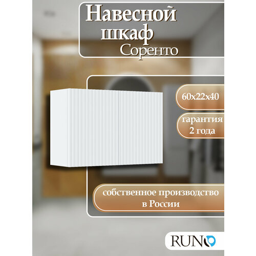 Шкаф с полкой навесной RUNO Соренто 60х40 (двустворчатый) - отличное решение для современного оформления Вашего дома. Волнистые рифленые фасады визуально «оживляют» и «приводят в движение» всю обстановку комнаты, сохраняя при этом умиротворение и покой. Шкафчик выполнен в традиционном и всегда модном белом цвете и гармонично впишется в любой интерьер. Шкаф навесной отлично впишется в ванную комнату, где Вы сможете его использовать для дополнительного хранения как шкаф навесной для ванной над стиральной машиной или мини шкаф пенал с полками. Можно использовать его и как шкаф в прихожую, где он будет использован как шкаф антресоль, и станет изюминкой Вашего помещения, привлекая к себе внимание своим необычным дизайном. Также можно найти применение ему на кухне, где использовать его как мини бар для хранения Вашей коллекции вин или шкаф кухонный навесной для всякой кухонной утвари, привлекая восторженные взгляды Ваших гостей. Возможно, использование шкафа навесного в детской комнате, как книжного шкафа или просто навесного шкафа для всяких мелочей. Конечно же, шкаф навесной можно использовать на балконе или лоджии, любителям цветов он подойдёт для хранения всевозможного инвентаря. Шкаф с полками поможет организовать пространство в разных помещениях Вашего дома, послужит подспорьем в оптимизации пространства и мест для хранения всевозможных вещей. Шкаф поставляется в разобранном виде, в комплект входят: боковины шкафа левая и правая, верхняя и нижняя части шкафа, полки, дверца, задняя стенка шкафа, петли (одна с доводчиком, одна без доводчика), навесы шкафа, набор комплектующих для сборки шкафа, инструкция по сборке. Мебель для ванной RUNO - красота и практичность в мелочах! Цвет товара на мониторе может отличаться от реальных цветов, это зависит от настроек цветового профиля и разрешения Вашего монитора или мобильного устройства.