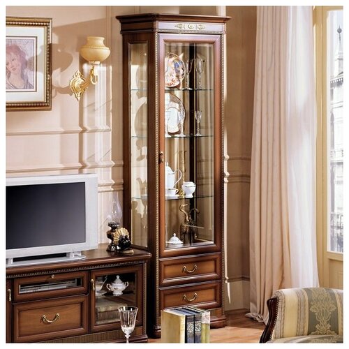 Шкаф однодверный предназначен для хранения посуды и столовых принадлежностей. Мебель выполнена в цвете орех, отделка легкой патиной. Задняя стенка шкафа драпирована тканью и обустроена внутренней подсветкой. Прозрачные боковые стенки в сочетании со стеклянными полками создают ощущение изящества и легкости. Фасад витрины декорирован резными накладными элементами. Высококачественная фурнитура обеспечивает долгий срок службы .