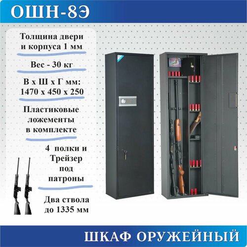 Шкаф односекционный соответствует всем требованиям МВД России. Корпус шкафа толщиной 1 мм, дверь толщиной 1 мм. На задней стенке корпуса расположены отверстия для крепления. Шкаф предназначен для хранения 2 стволов оружия и оснащен отделением под патроны. Ложементы — пластик. В дверь установлены 1 электронный замок и 1 ключевой сувальдный замок ЗАО «Про-Сам» г. Рязань или аналогичный замок другого производителя. Цвет: Черный