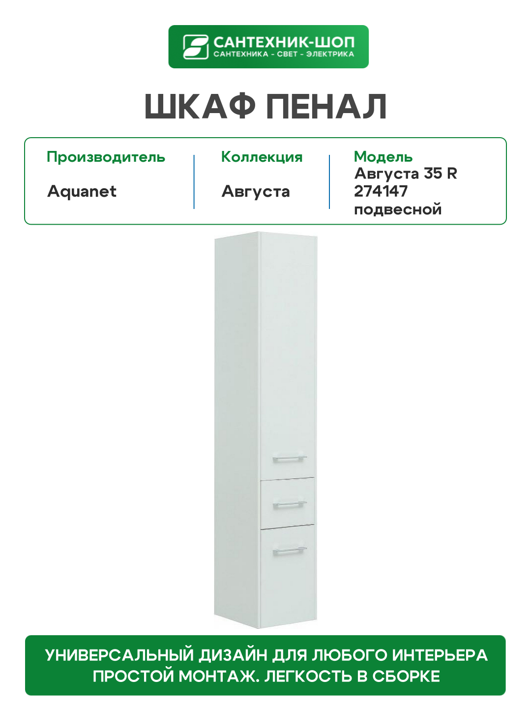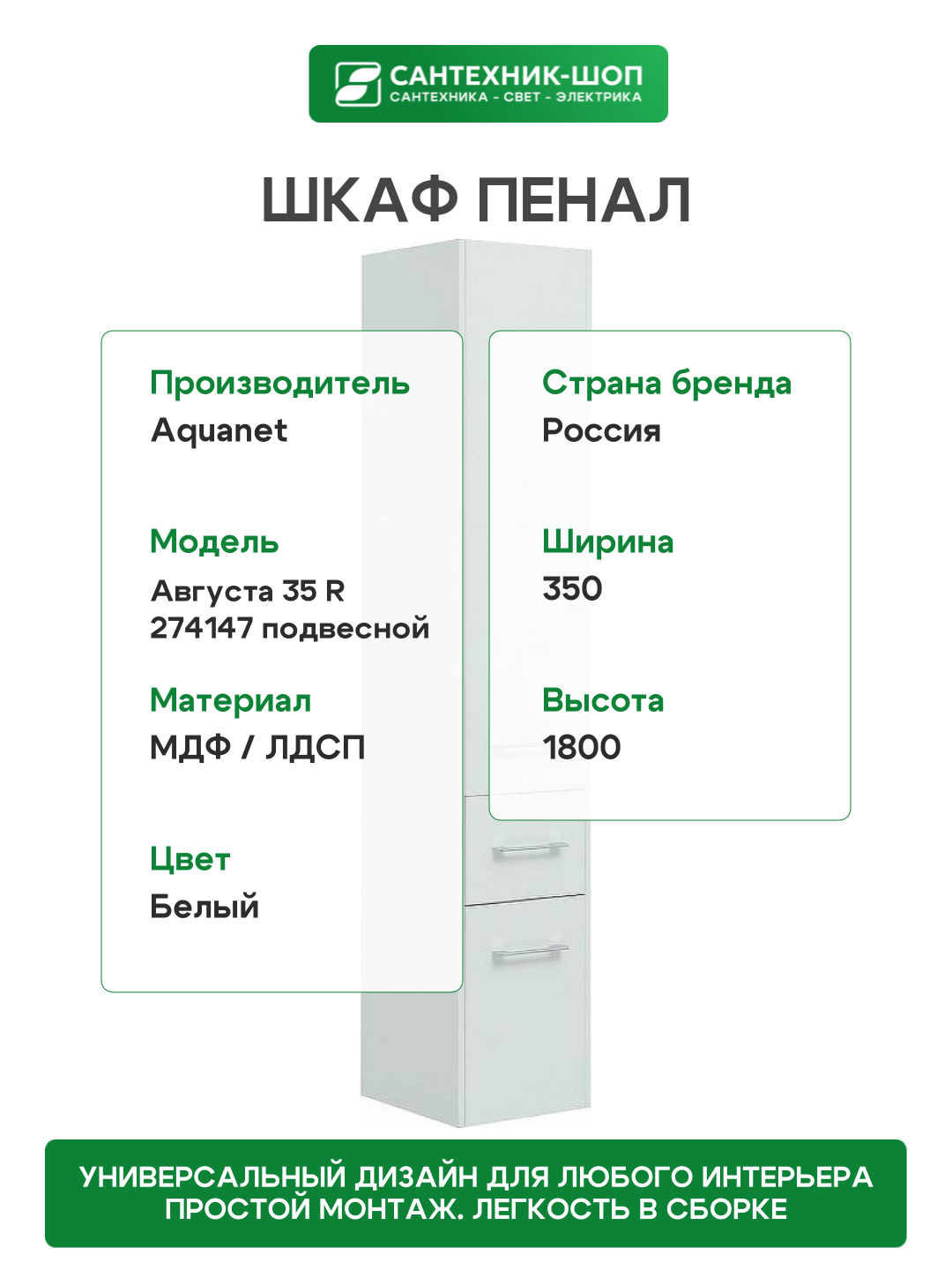Шкаф пенал Aquanet Августа 35 R 274147 подвесной Белый глянец МДФ / ЛДСП: сравнение цен, характеристики, фото, актуальное наличие и цены.