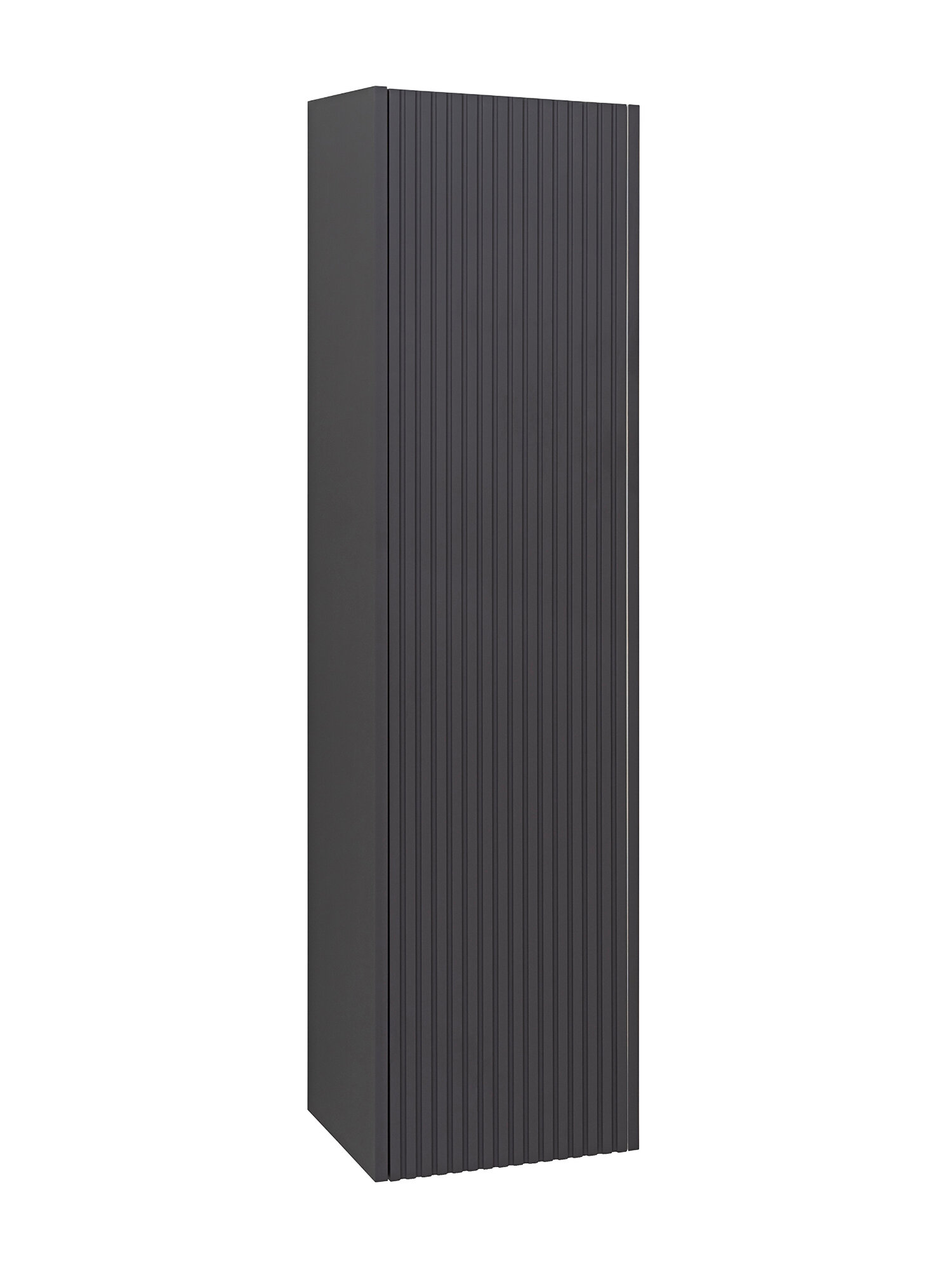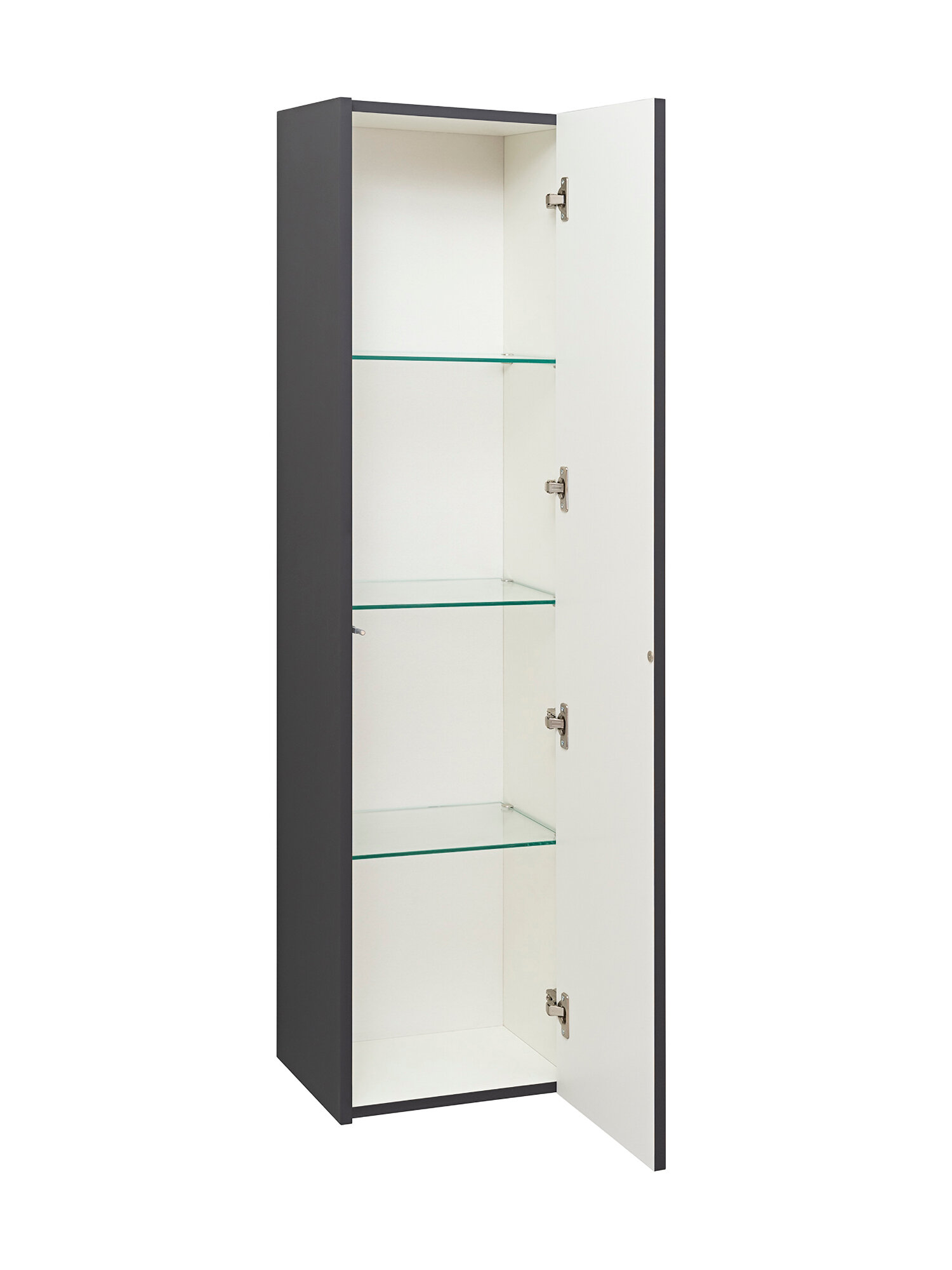 Подвесной шкаф-пенал MONACO 35см /графит/ с одной распашной дверью, которая открывается благодаря механизму Push-to-open. Стеклянные полки на хромированных полкодержателях с фиксатором придают модели изящность и практичность.
