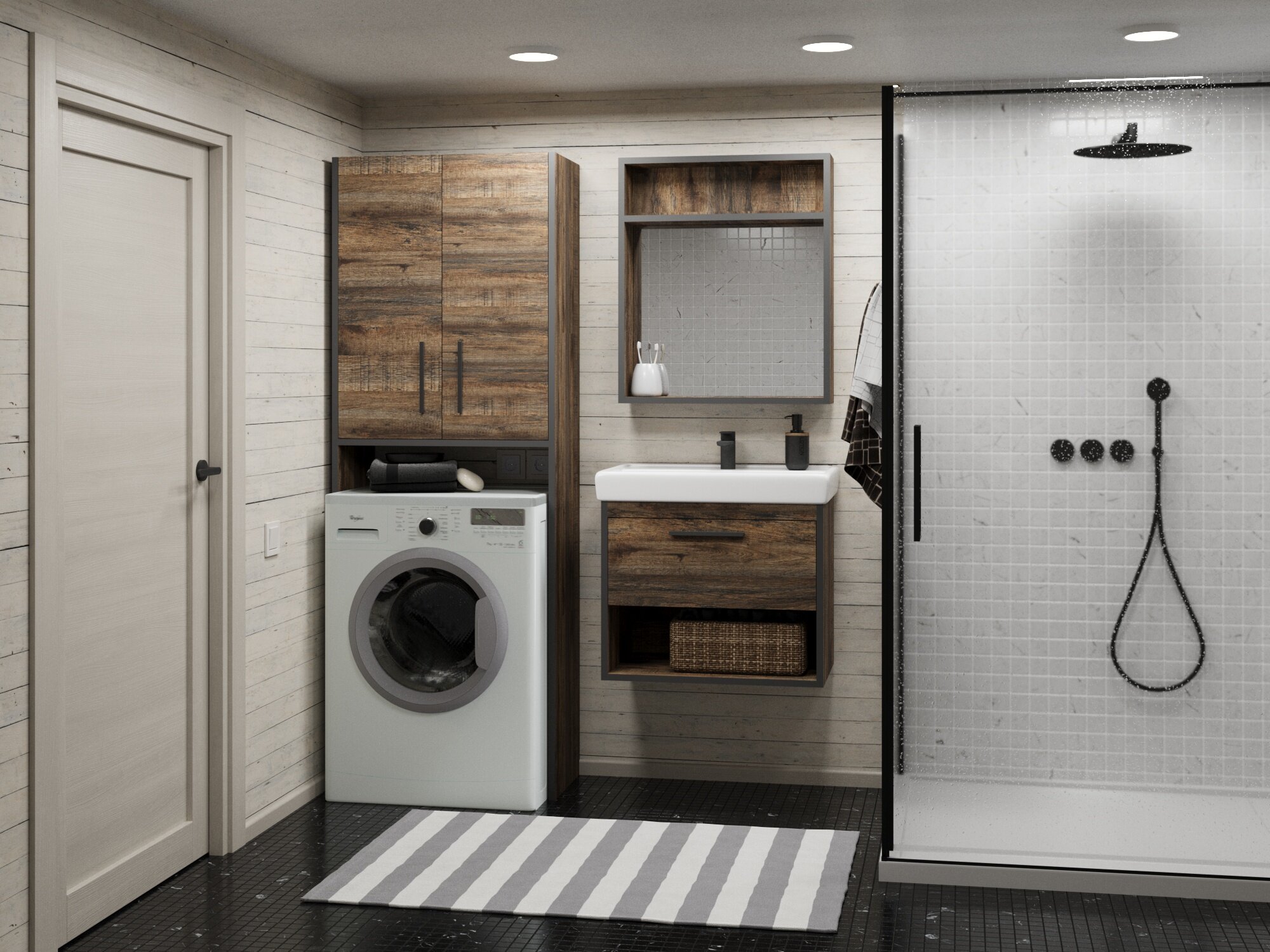 Современная мебель для ванны сочетает не только стиль, надежность и практичность, но и натуральные материалы. Корпус и фасад пенала выполнен из ламинированной древесно-стружечной плиты (ЛДСП). В сочетании с термореактивной смолой мебель для ванны получает устойчивость к перепаду температур, высокую ударопрочность, долговечность и легкость в уходе. Благодаря ламинированному покрытию шкаф устойчив к влаге, поэтому отлично подходит для установки в ванной комнате или туалете.