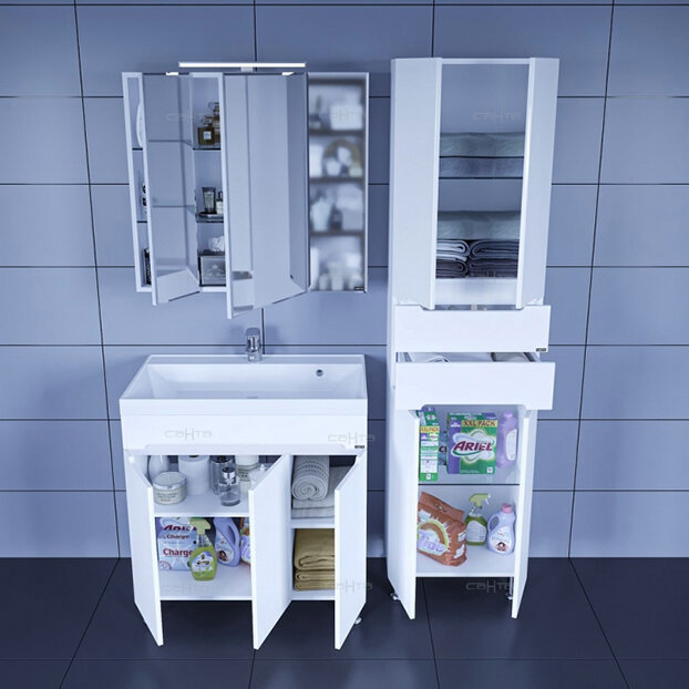 Фасады выполнены из МДФ, покрытой белой глянцевой ПВХ-пленкой. За каждой дверцей на петлях плавного закрывания расположено по дополнительной стеклянной полочке для создания дополнительного места для хранения.