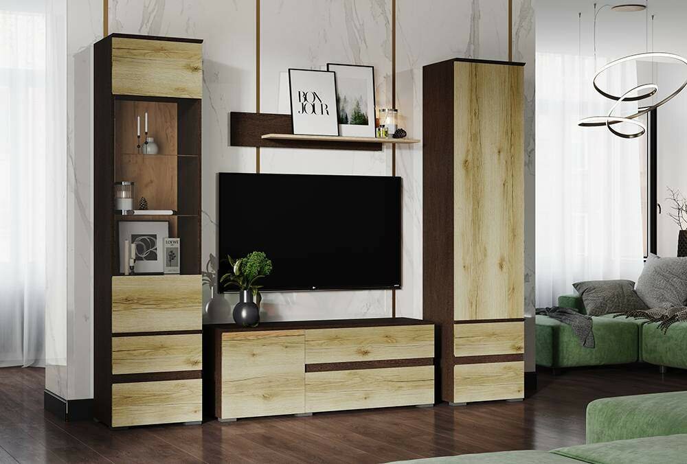 Шкаф-пенал Плейона выполнен в современном стиле, который гармонично впишется в интерьер гостиной. Цвет корпуса и фасада – коричневый и бежевый, что позволяет шкафу легко сочетаться с различными оттенками мебели и декора.