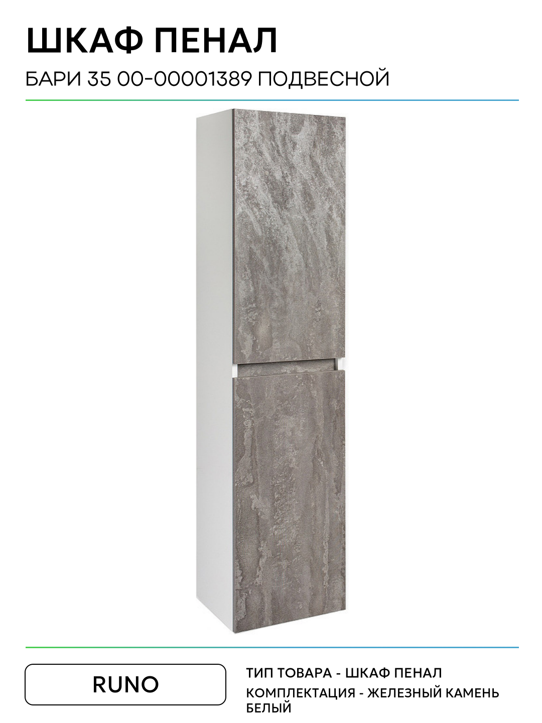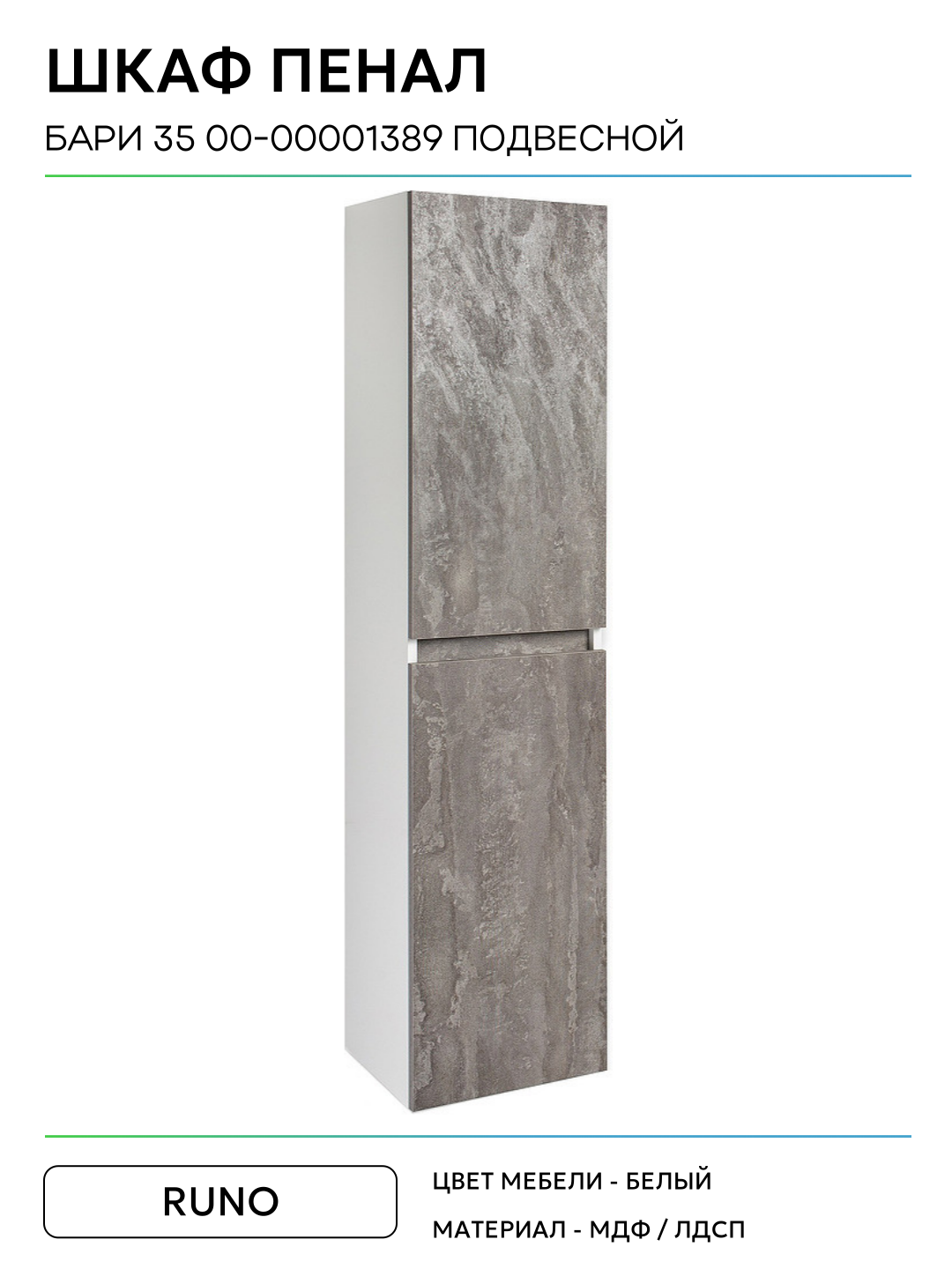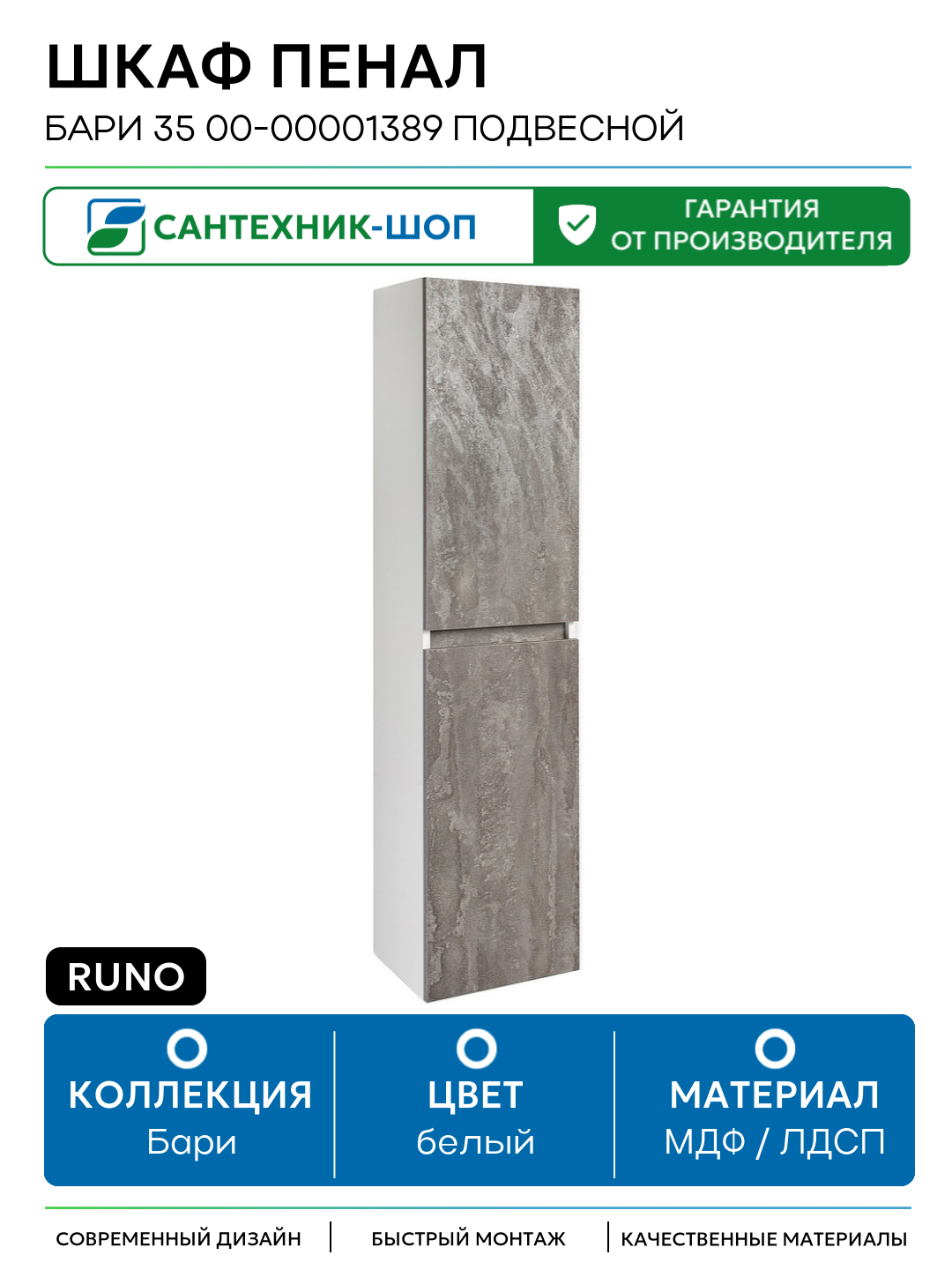 Шкаф пенал Runo Бари 35 00-00001389 подвесной Железный камень Белый МДФ / ЛДСП белый с дверками Россия: сравнение цен, характеристики, фото, актуальное наличие и цены.