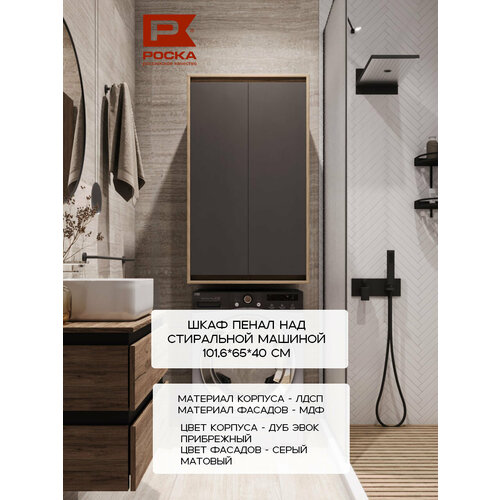 Шкаф-пенал деревянный Роска 650 для ванной комнаты под стиральную машину подвесной. Габаритные размеры: высота 1016 мм, ширина 650 мм, глубина 400 мм. Корпус изготовлен из Ламинированного ДСП толщиной 16 мм, кромка 0,5. Фасады изготовлены из МДФ толщиной 16 мм. Цвет корпуса Дуб Эвок Прибрежный, фасадов Графит (без текстуры).