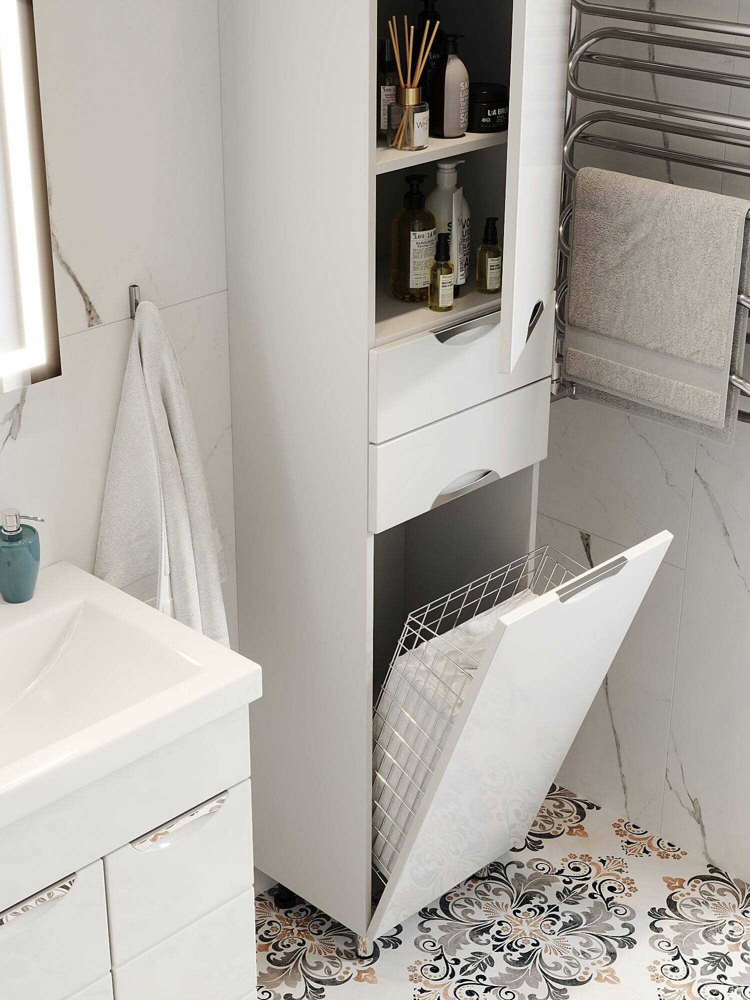 Шкаф полка для ванной комнаты FAURAplus, Люкс (Толедо) 40, напольный, правый, с корзиной, белый, глянцевый.: сравнение цен, характеристики, фото, актуальное наличие и цены.