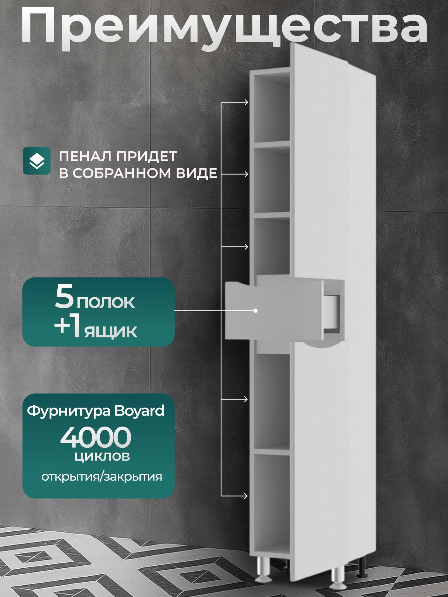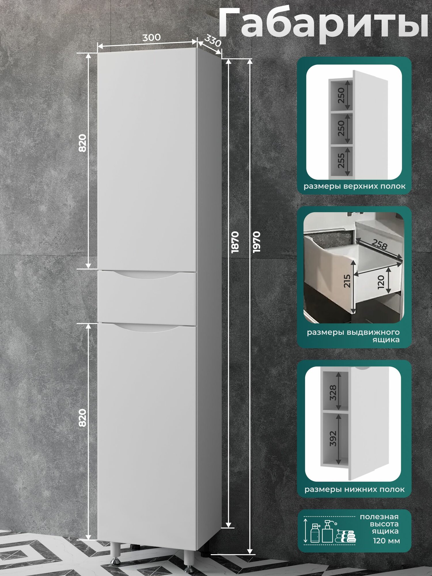 Изготовленный с акцентом на качество и долговечность, этот шкаф станет надежным спутником в ваших ежедневных ритуалах. Просторные полки обеспечивают достаточное место для хранения всевозможных предметов: от косметики и средств личной гигиены до полотенец и бытовых принадлежностей. Плавные линии и современный дизайн делают его можно не только практичным, но и эстетически привлекательным элементом вашего интерьера.