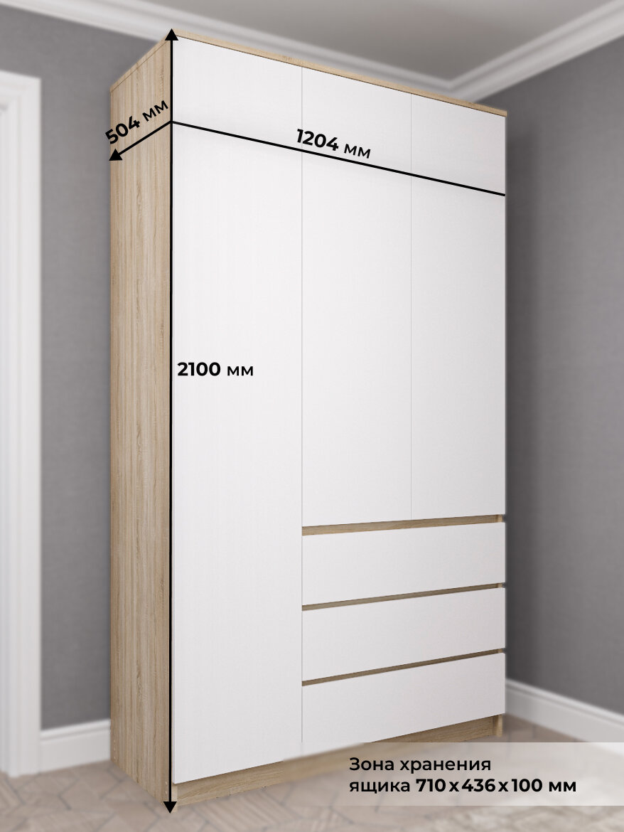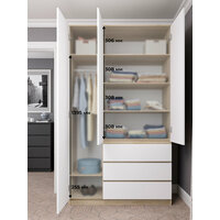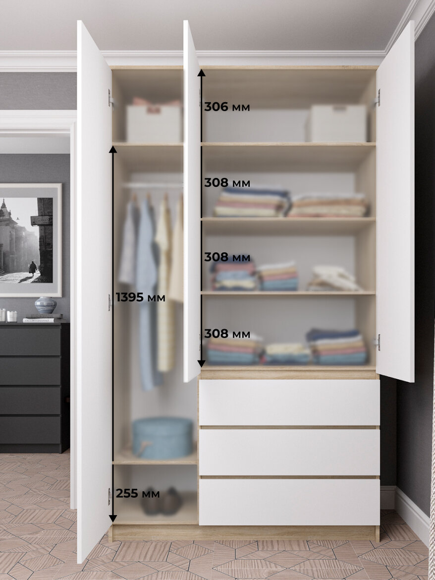 - прочная конструкция: шкаф имеет надежную конструкцию и изготовлен из прочных и экологически безопасных материалов, гарантирующих его стабильность и долгий срок службы. Состоит шкаф из центральной части, с широкими и достаточно глубокими полками, и нижней части с выдвижными ящики на роликовых направляющих. Боковая часть оснащена полками и штангой для плечиков.