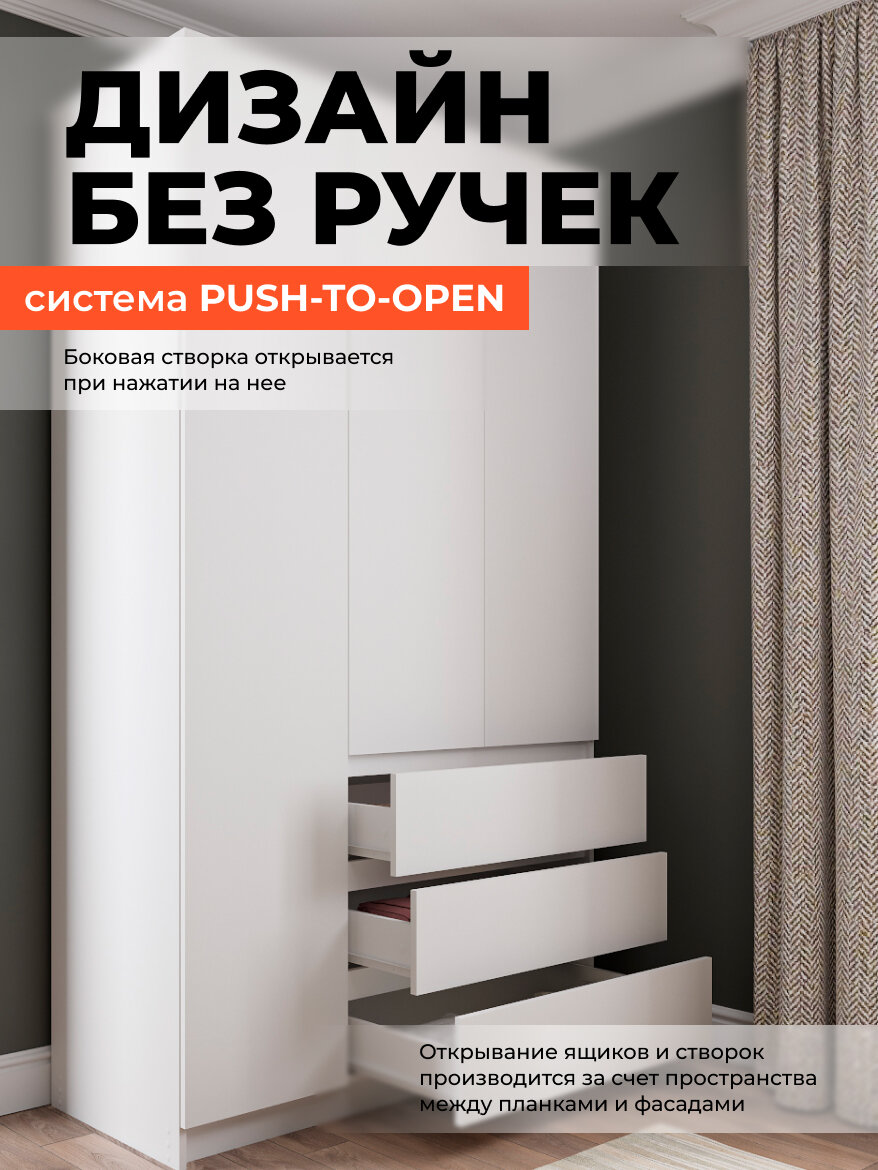 - Створки (дверцы) шкафа для одежды открываются при помощи системы PUSH-TO-OPEN. Открывание ящиков и створок, производится за счет пространства между планками и фасадом. На фасадах ящиков и центральных створках отсутствуют ручки, функцию ручек выполняет сам фасад (фасады с внутренней стороны прямые под углом 90).