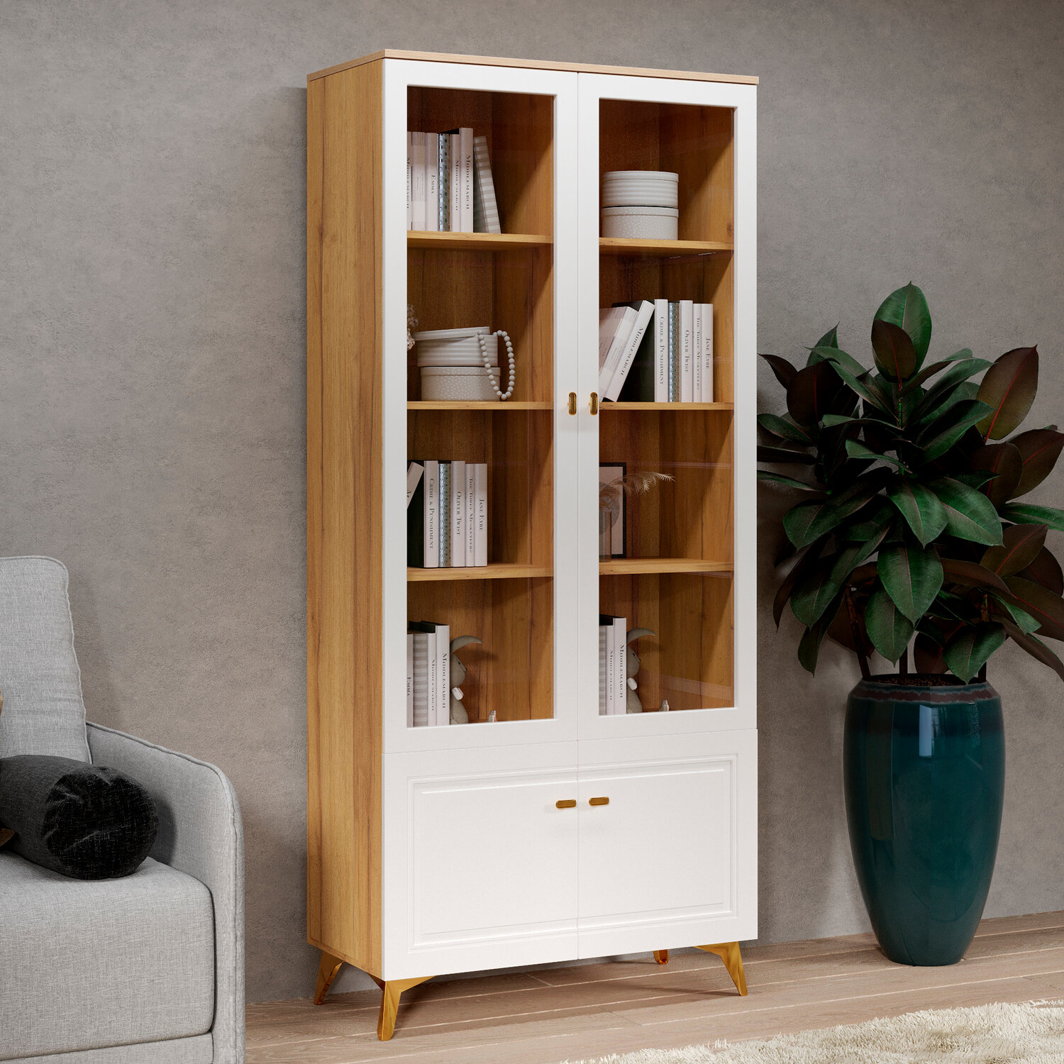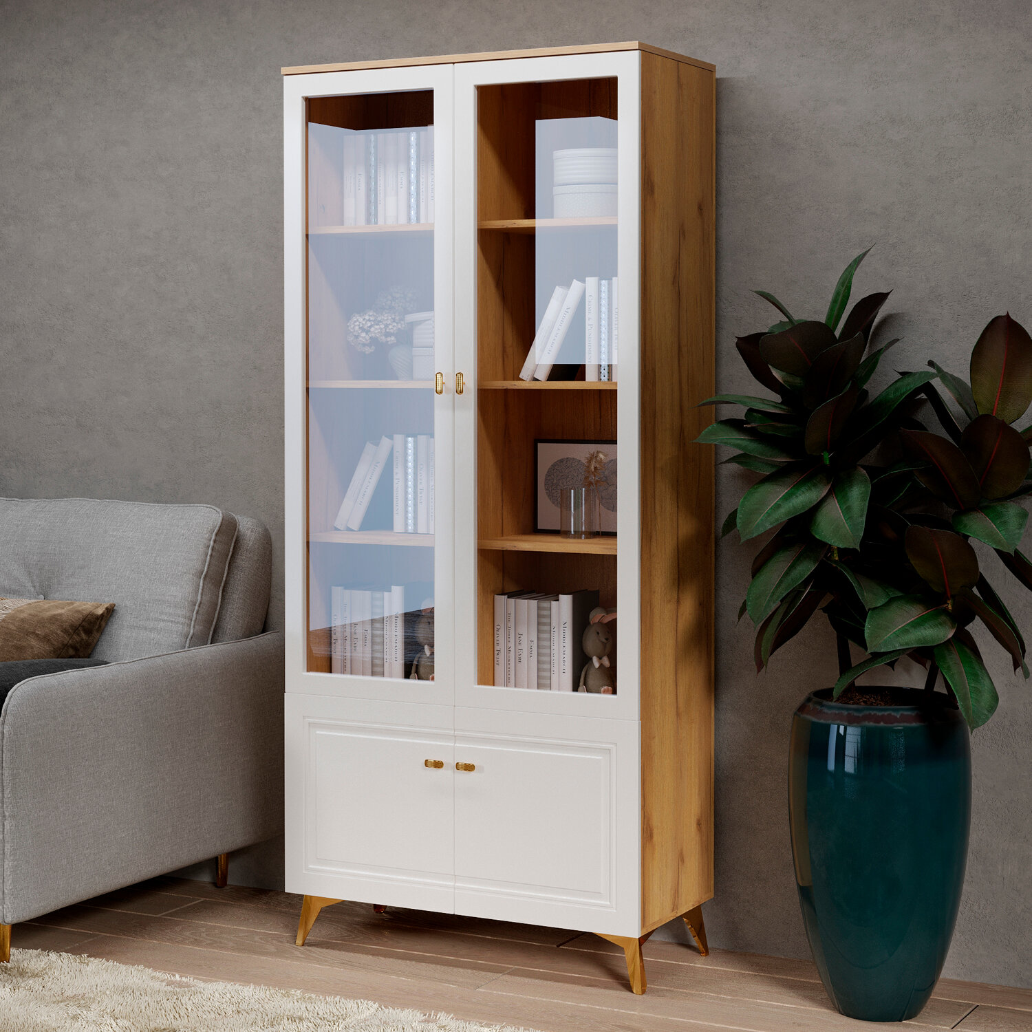 Конструкция шкафа включает две распашные двери со стеклянными вставками, которые обеспечивают обзор содержимого шкафа. Корпус и фасад изготовлены из качественного материала – ЛДСП и МДФ соответственно. Фурнитура выполнена из металла и имеет золотистый цвет, что придает шкафу особый шарм.