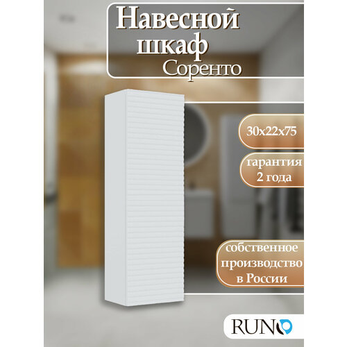 Шкаф с полками навесной RUNO Соренто (одностворчатый) - отличное решение для современного оформления Вашего дома. Рифленые фасады с горизонтальным расположением волны, визуально «оживляют» и «приводят в движение» всю обстановку комнаты, сохраняя при этом умиротворение и покой. Шкафчик выполнен в традиционном и всегда модном белом цвете и гармонично впишется в любой интерьер. Шкаф навесной отлично впишется в ванную комнату, где Вы сможете его использовать для дополнительного хранения как шкаф навесной для ванной над стиральной машиной или мини шкаф пенал с полками. Можно использовать его и как шкаф в прихожую, где он станет изюминкой Вашего помещения и будет привлекать к себе внимание своим необычным дизайном. Также можно найти применение ему на кухне, где использовать его как мини бар для хранения Вашей коллекции вин или шкаф кухонный навесной для всякой кухонной утвари, привлекая восторженные взгляды Ваших гостей. Возможно, использование шкафа навесного в детской комнате, как книжного шкафа или просто навесного шкафа для всяких мелочей. Конечно же, шкаф навесной можно использовать на балконе или лоджии, любителям цветов он подойдёт для хранения всевозможного инвентаря. Шкаф с полками поможет организовать пространство в разных помещениях Вашего дома, послужит подспорьем в оптимизации пространства и мест для хранения всевозможных вещей. Шкаф поставляется в разобранном виде, в комплект входят: боковины шкафа левая и правая, верхняя и нижняя части шкафа, полки, дверца, задняя стенка шкафа, петли (одна с доводчиком, одна без доводчика), навесы шкафа, набор комплектующих для сборки шкафа, инструкция по сборке. Для изменения стороны открывания, шкаф можно повернуть на 180 градусов. Мебель для ванной RUNO - красота и практичность в мелочах! Цвет товара на мониторе может отличаться от реальных цветов, это зависит от настроек цветового профиля и разрешения Вашего монитора или мобильного устройства.
