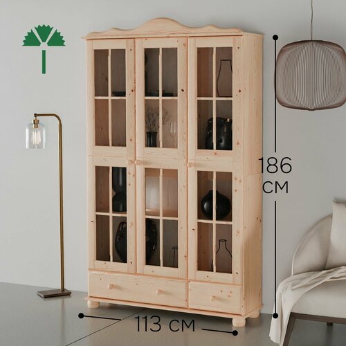 Шкаф с витриной изготовлена из натурального дерева сосны от белорусского производителя мебели "Диприз". Шкаф с витриной отличается элегантным современным дизайном, который легко сочетается с любым стилем и декором! Двери витрины оснащены стеклянными вставками. На деревянных полках найдут свое место различные скульптуры и книги, также можно разместить стаканы, чашки и другую посуду, так и для домашней библиотеки или личных вещей. Шкаф с витриной будет отлично смотреться в вашем загородном доме. Материал задней стенки и дно ящика - фанера, остальное - сосна. Размер ящиков - 297*246*142,8(М), 663*246*142,8(Б). Толщина дерева двери и фасада ящика - 18мм, остальное - 14мм. Комплектация составляет: 8 полок и 2 ящика.