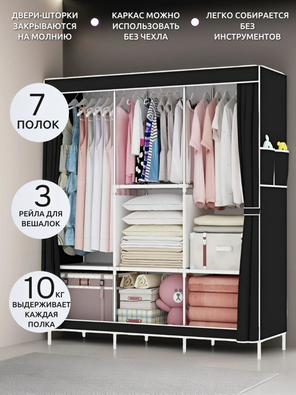 Этот напольный тканевый шкаф - практичная мебель для временого жилья, съемной квартиры, коммунальной квартиры, для студентов, гостевых домов, турбазы и т. д. Вы сможете легко менять расположение полок и штанги, чтобы адаптировать его под ваши нужды. Если вам необходимо поставить шкаф в общежитии, то такой вариант станет идеальным приобретением за счет своей цены, практичности и мобильности.