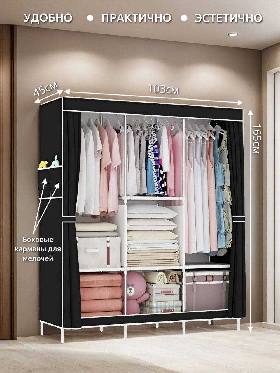 Шкаф тканевый для одежды - это удобная система хранения для ваших вещей. Этот раскладной шкаф из ткани идеально подойдет для хранения одежды, коробок, игрушек или других предметов. Размеры шкафа: ширина 103см, глубина 45см, высота 170см. В комплекте идет 7 полок и 3 штанги для вешалок.