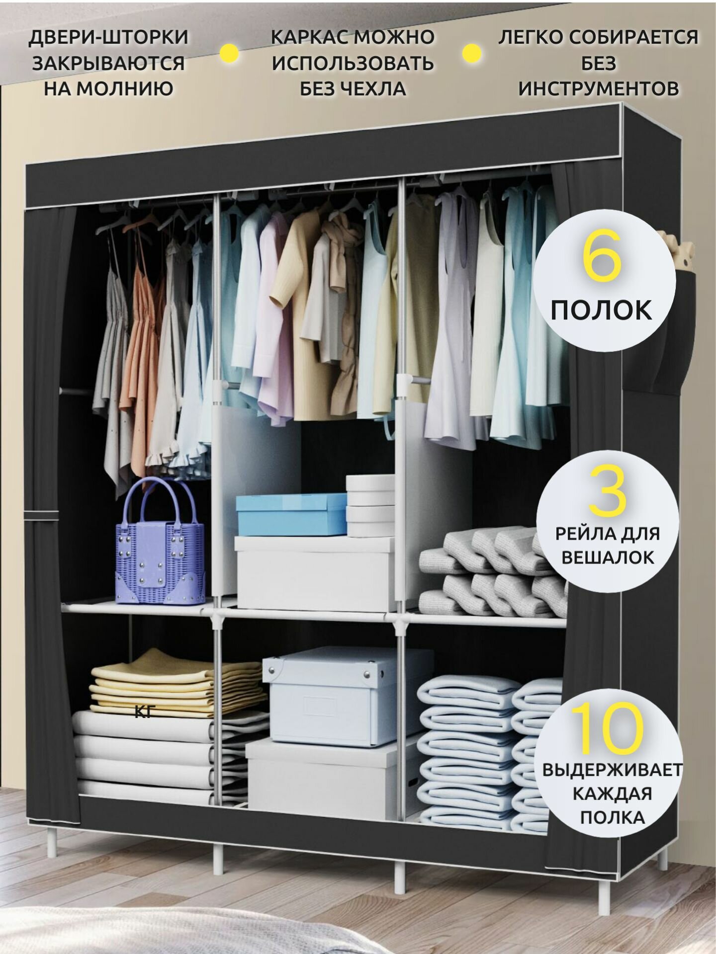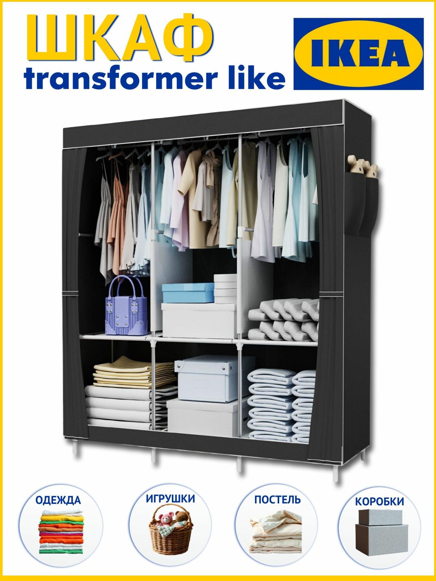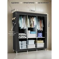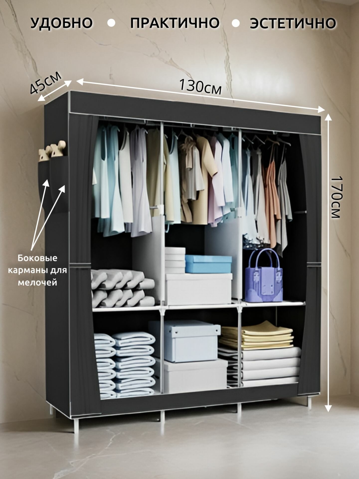 Шкаф из ткани каркасный черный - это закрытая система хранения для вещей, одежды, игрушек. Размер шкафа - ширина 130см, глубина 45см, высота 170см.