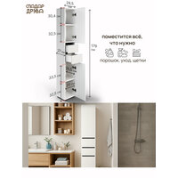 Модель выполнена в белом цвете, имеет ширину 285 мм и высоту 1790 мм, что делает её удобным решением для небольших ванных комнат. Изделие изготовлено из ЛДСП, которое обладает достаточной влагостойкостью и хорошо подходит для эксплуатации во влажных помещениях. В конструкции предусмотрены полки и выдвижные ящики, что позволяет рационально организовать хранение бытовой химии, полотенец и аксессуаров. Конструкция устойчива и не требует дополнительного крепления — шкаф пенал в ванную напольный узкий устанавливается прямо на пол и надёжно фиксируется.