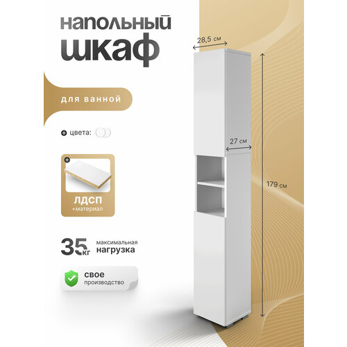 Изделие изготовлено из ЛДСП, устойчивого к влаге и механическим воздействиям, что делает его подходящим для помещений с повышенной влажностью. Высота 1800 мм и ширина 770 мм обеспечивают достаточный объём для хранения бытовой химии, полотенец и аксессуаров. В конструкции предусмотрены открытые полки для часто используемых предметов и закрытый шкафчик, который помогает поддерживать аккуратный вид. Благодаря устойчивой опоре шкаф в ванную напольный высокий надёжно стоит на полу и не требует дополнительного крепления.