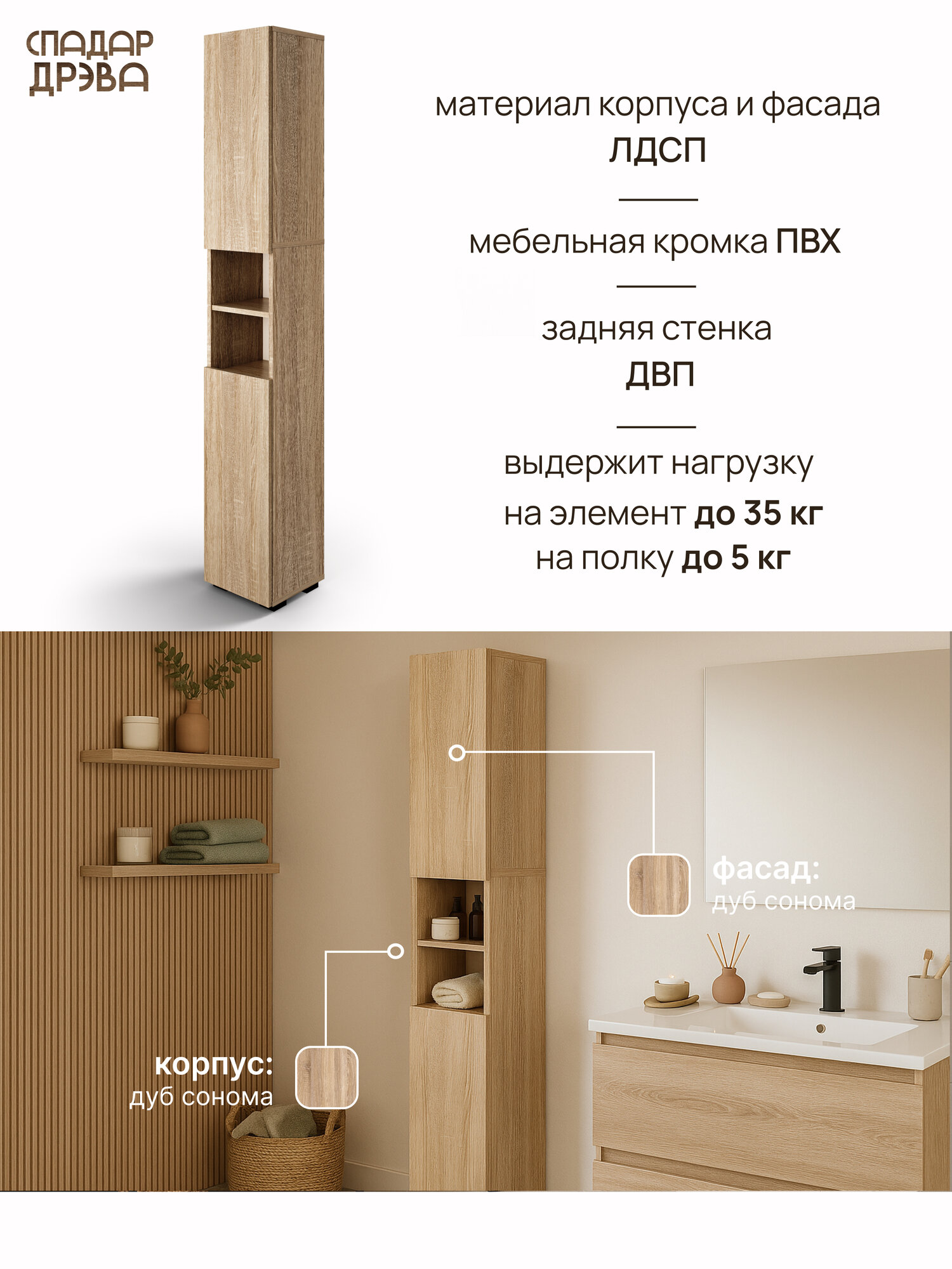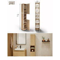 Модель стилизована под дерево, имеет ширину 285 мм и высоту 1790 мм, что делает её удобным решением для небольших ванных комнат. Изделие изготовлено из ЛДСП, которое обладает достаточной влагостойкостью и хорошо подходит для эксплуатации во влажных помещениях. Внутри расположены несколько полок для хранения бытовой химии, полотенец и аксессуаров. Конструкция устойчива и не требует дополнительного крепления — шкаф пенал в ванную напольный узкий устанавливается прямо на пол и надёжно фиксируется.