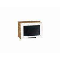 Купить Шкаф верхний горизонтальный остекленный Глетчер, цвет фасада Айленд Силк, цвет каркаса Дуб Вотан, стекло Lacobel «Black», 358*500*318 мм с доставкой по всей России.