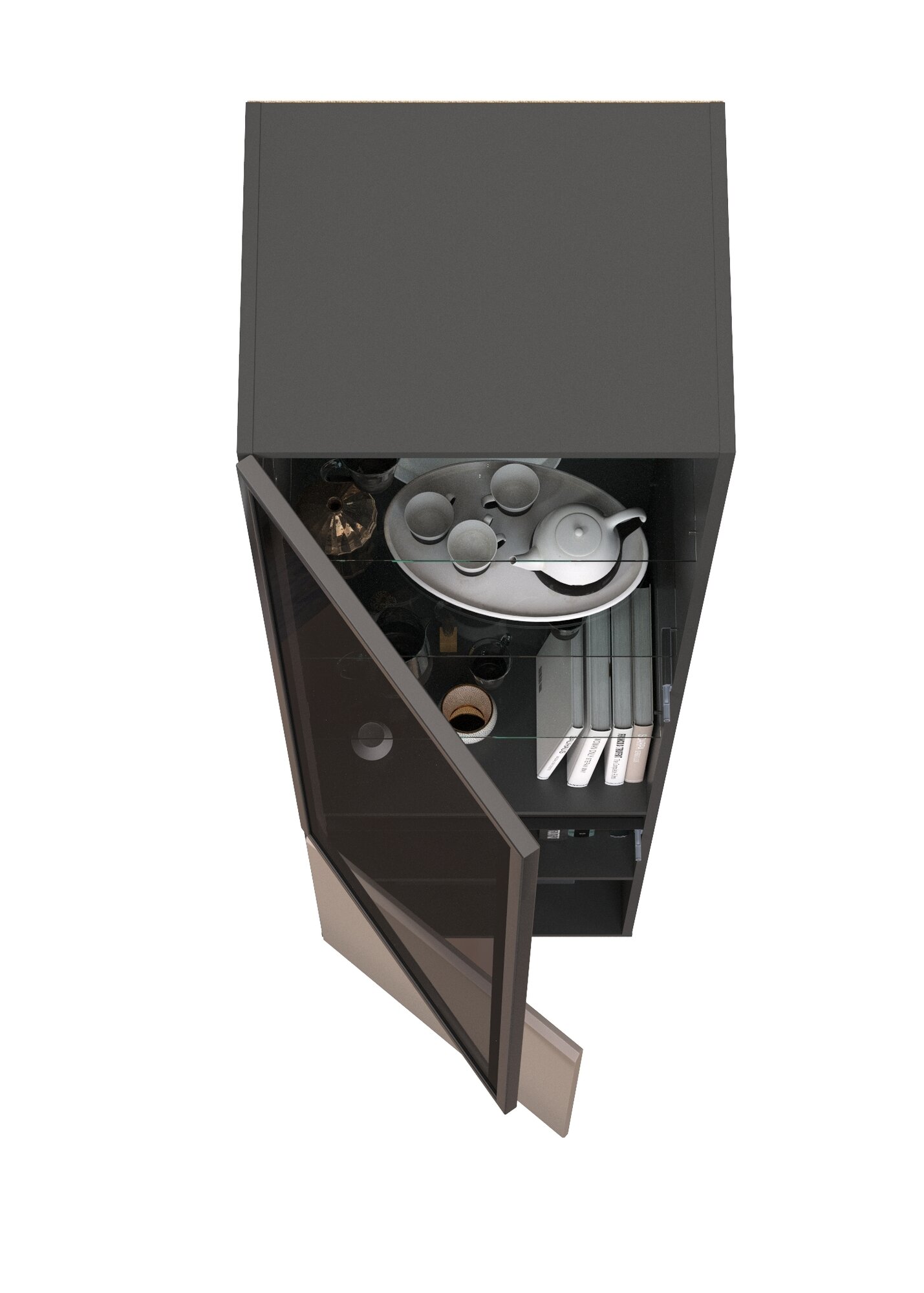 разделён на два отделения за распашными дверками - верхнее и нижнее; верхнее отделение со стеклянной дверкой, за которой располагаются три стеклянные полки; за глухой дверкой нижнего отделения имеется одна полочка