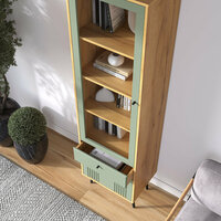 Конструкция шкафа-витрины включает в себя две секции, что позволяет разместить в нем большое количество предметов. Особенностью шкафа является наличие ящика, что делает его еще более функциональным. В ящике можно хранить мелкие предметы, которые должны быть всегда под рукой, но не должны занимать место на полках.