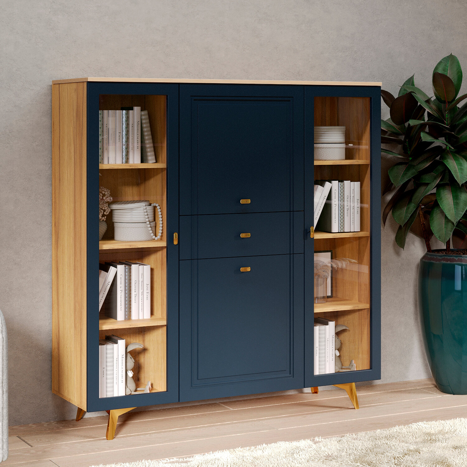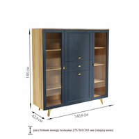 Шкаф-витрина оснащен четырьмя распашными дверями со стеклянными вставками, что позволяет демонстрировать ваши любимые книги, украшения или другие предметы. Внутри шкафа расположены шесть полок и один ящик для хранения мелких предметов.