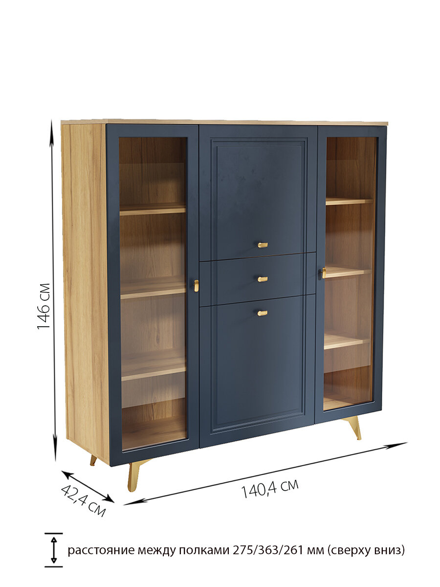 Шкаф-витрина Кураж Вега Сапфир выполнен в современном стиле, который гармонично впишется в интерьер гостиной, детской комнаты или спальни. Темно-синий цвет корпуса и фасада, а также золотистая фурнитура придают шкафу изысканный вид.
