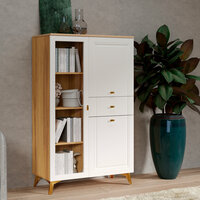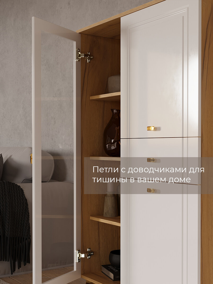 Шкаф-витрина оснащен тремя полками и одним ящиком, что позволяет удобно разместить различные предметы. В комплекте также идут доводчики, обеспечивающие плавное и бесшумное закрывание дверей.