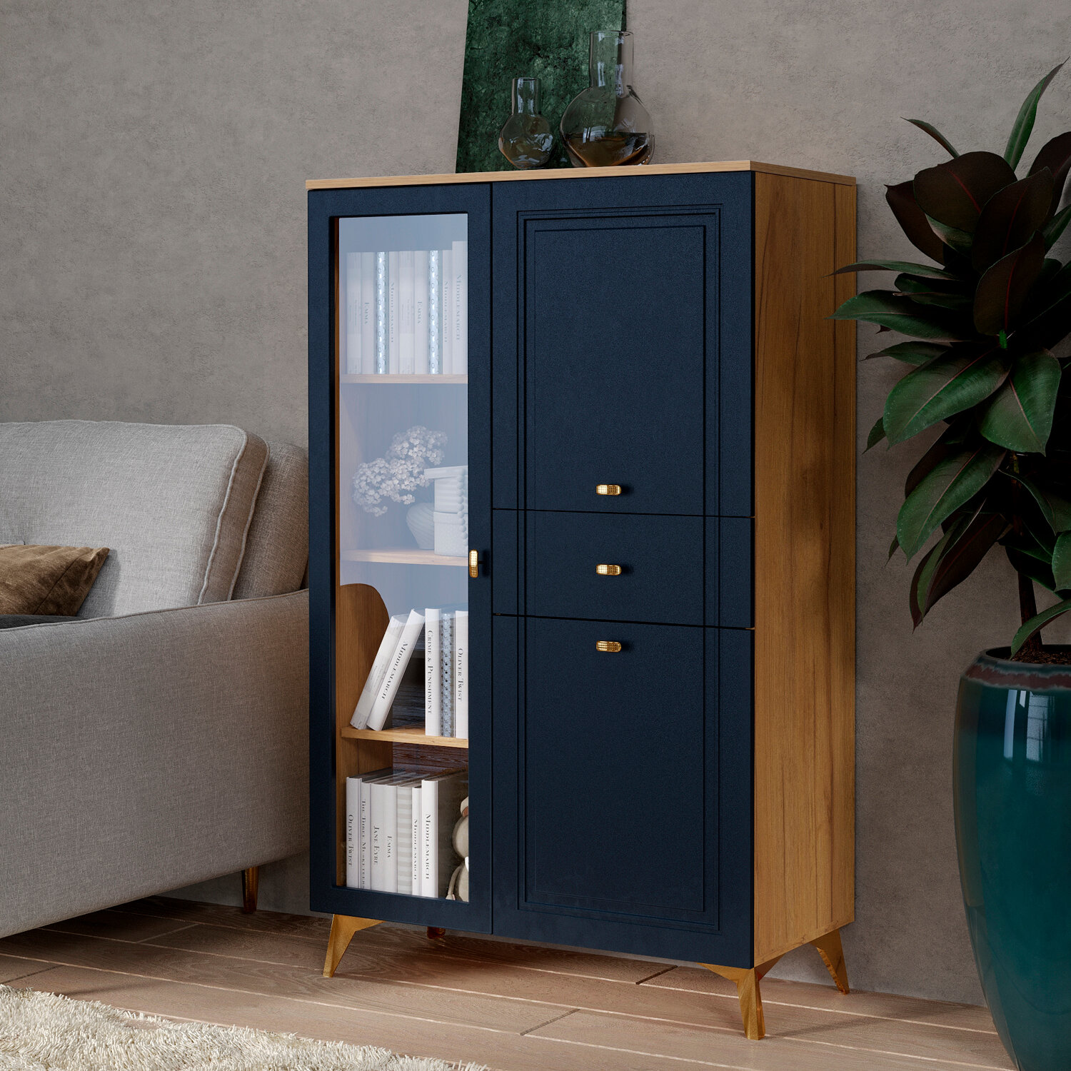 Шкаф-витрина Кураж Вега Сапфир выполнен в современном стиле, который гармонично впишется в интерьер гостиной, спальни, детской комнаты или кухни. Цвет дуб и синий, а также золотистая фурнитура добавляют шкафу элегантности и изысканности.