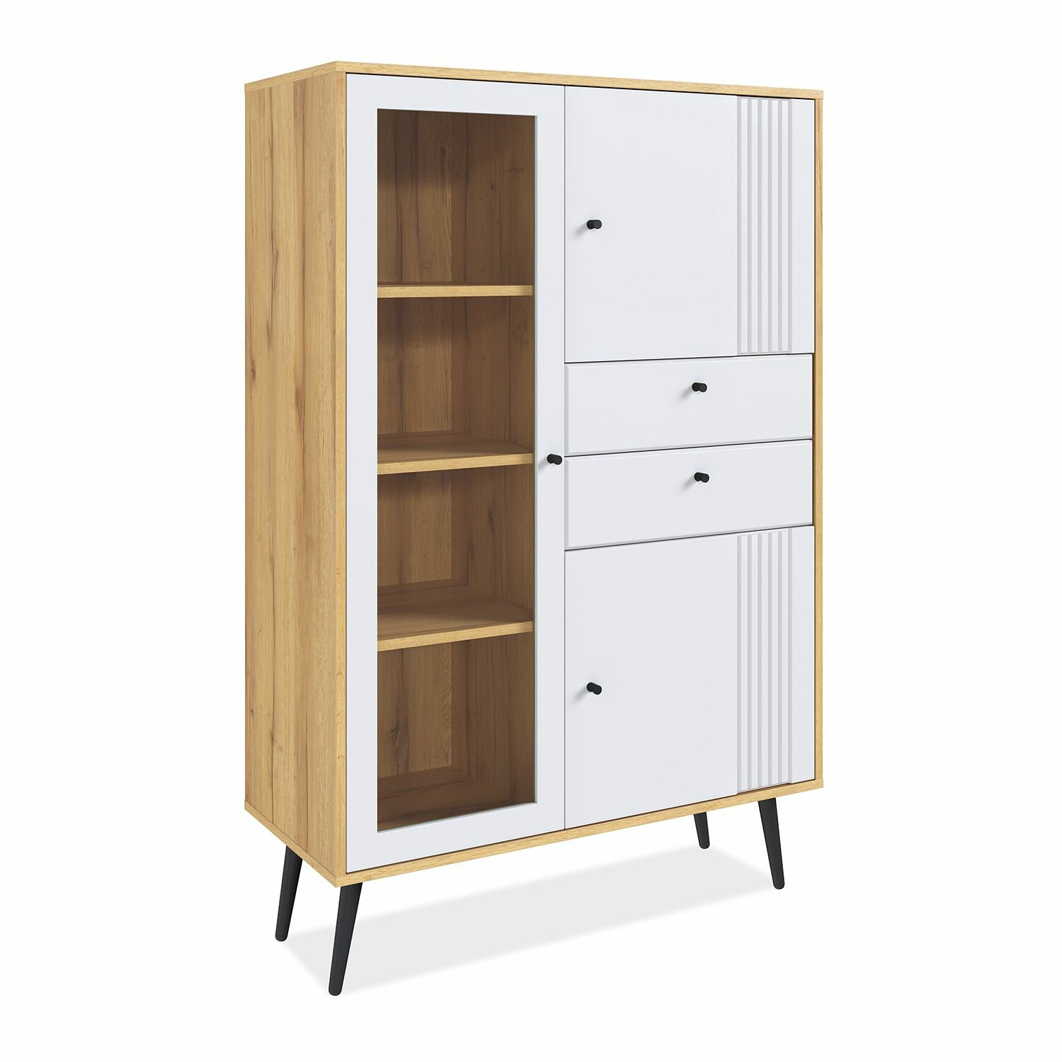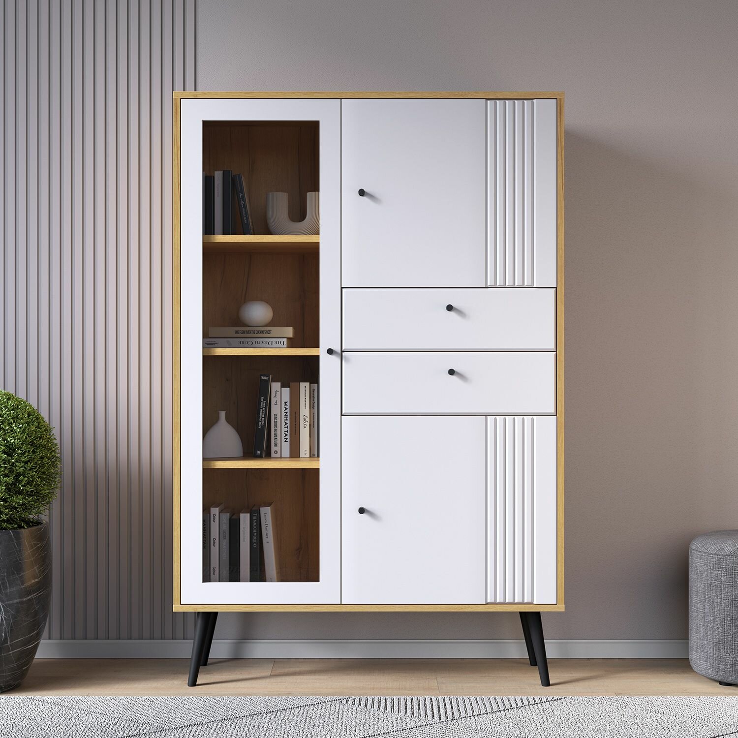 Особенностью шкафа является наличие двух ящиков для хранения мелких предметов и дверь со стеклом для демонстрации коллекции книг или посуды.