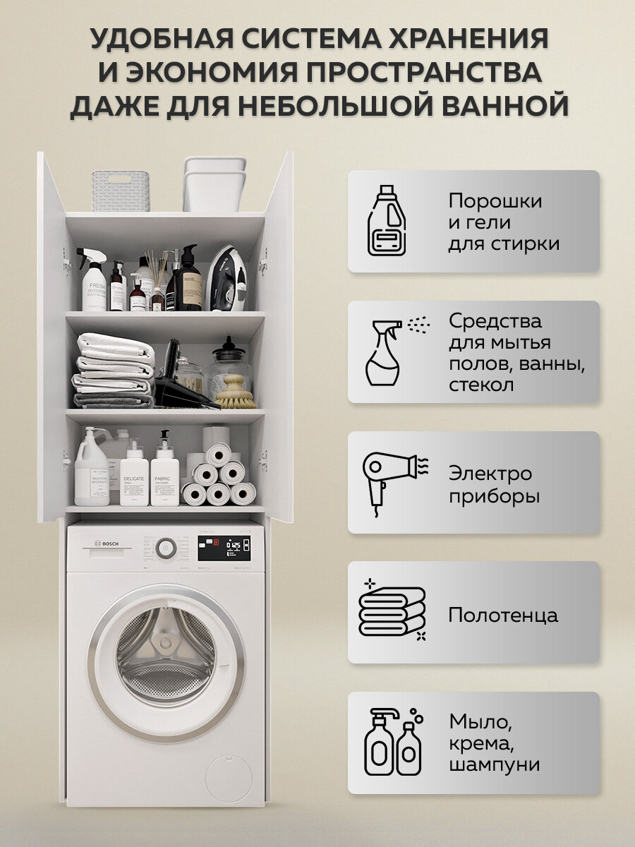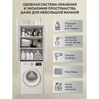 Габаритные размеры шкафчика позволяют удобно разместить его над стиральной машиной и максимально эффективно использовать доступное пространство. Внутри шкафчика можно хранить различные предметы гигиены и другие необходимые вещи, поддерживая порядок и чистоту в ванной комнате.