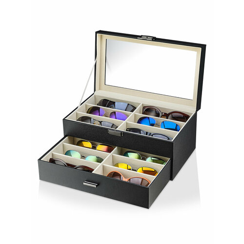 Шкатулка - это стильный и функциональный аксессуар, который станет удобным решением для организации процесса хранения очков, в том числе солнечных. Ее внешняя отделка выполнена из высококачественной искусственной кожи. Что гарантирует долговечность и простоту в уходе за органайзером. В крышке расположено минеральное стекло. Она плотно закрывается, обеспечивая дополнительную защиту от пыли и влаги.