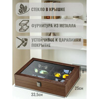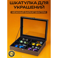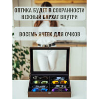 Шкатулка - это стильный и функциональный аксессуар, который станет удобным решением для организации процесса хранения очков, в том числе солнцезащитных. Ее внешняя отделка выполнена из высококачественной искусственной кожи с рисунком под дерево. Что гарантирует долговечность и простоту в уходе за органайзером. В крышке расположено минеральное стекло. Она плотно закрывается, обеспечивая дополнительную защиту от пыли и влаги.