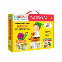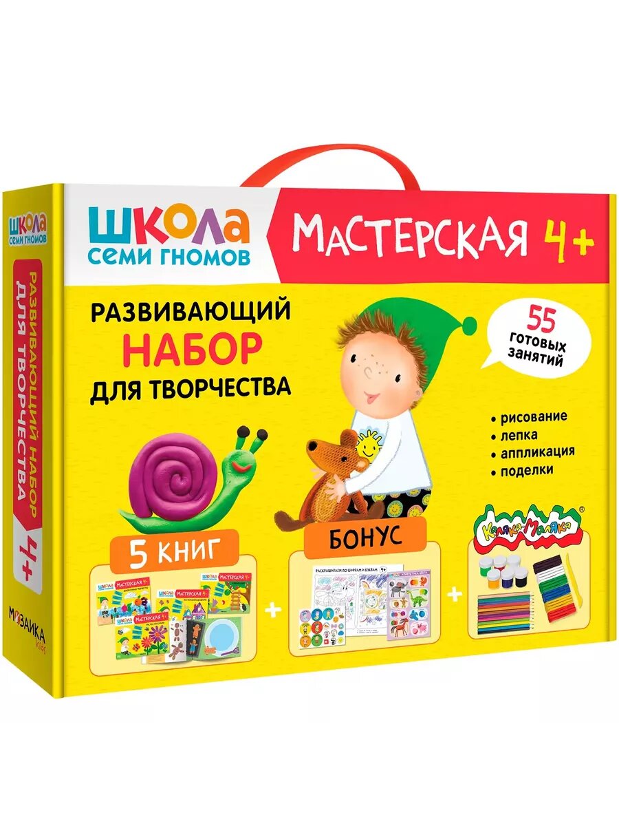 «Школа Семи Гномов. Мастерская 4+» включает в себя увлекательный набор альбомов с занятиями для детей от 4 до 5 лет и необходимые материалы: пластилин, карандаши и краски. Кроме того, внутри набора ждет приятный бонус — большой плакат (70Х50 см) для рисования по точкам, разработанный в соответствии с возрастными возможностями ребенка, обучающий плакат «Арифметика цвета» и поощрительные наклейки. С этим подарочным комплектом ваш ребенок откроет мир развивающих занятий и творчества. Пошагово, с увеличением сложности заданий, малыш погрузится в мир творчества, создавая уникальные поделки. Всего в программу комплекта входит 5 развивающих альбомов, по которым ребенок изучит разные виды творчества: аппликация, декоративное творчество, лепка, рисование карандашами и красками.