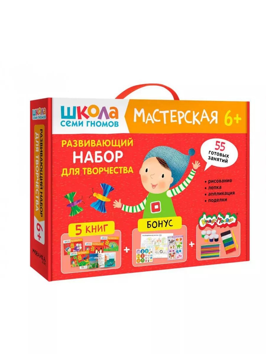 «Школа Семи Гномов. Мастерская 6+» включает в себя увлекательный набор альбомов с занятиями для детей от 6 до 7 лет и необходимые материалы: пластилин, карандаши и краски. Кроме того, внутри набора ждет приятный бонус — большой плакат (70Х50 см) для рисования по точкам, разработанный в соответствии с возрастными возможностями ребенка, обучающий плакат «Арифметика цвета» и поощрительные наклейки. С этим подарочным комплектом ваш ребенок откроет мир развивающих занятий и творчества. Пошагово, с увеличением сложности заданий, малыш погрузится в мир творчества, создавая уникальные поделки. Всего в программу комплекта входит 5 развивающих альбомов, по которым ребенок изучит разные виды творчества: аппликация, декоративное творчество, лепка, рисование карандашами и красками.